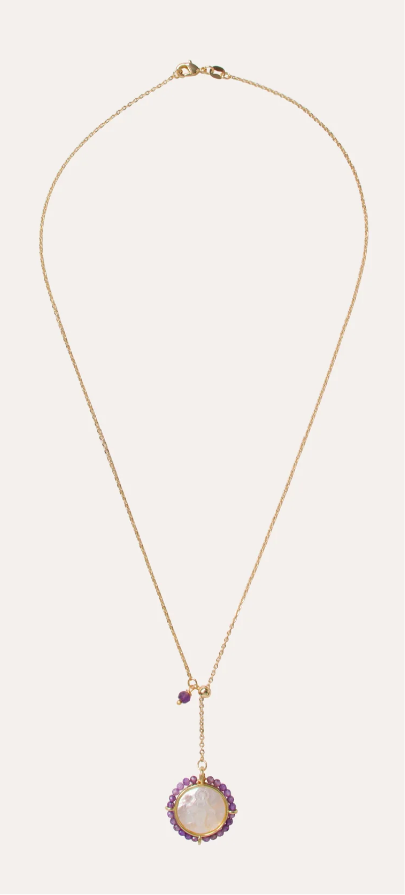 The Gabbi Kelly Adjustable Necklace beautifully balances eclectic elegance. A striking Mother of Pearl medallion surrounded with lavender beads falls from an 18k gold chain that can be easily adjusted to suit your spring look.