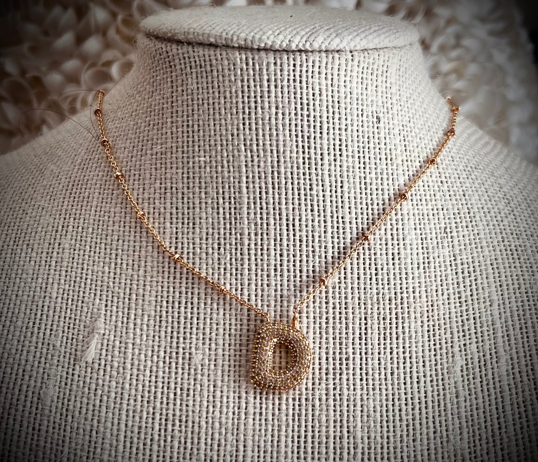 18k Gold plated CZ pave Bubble Initial Pendant with 14k anti tarnish 16” satellite chain with 2” extender.