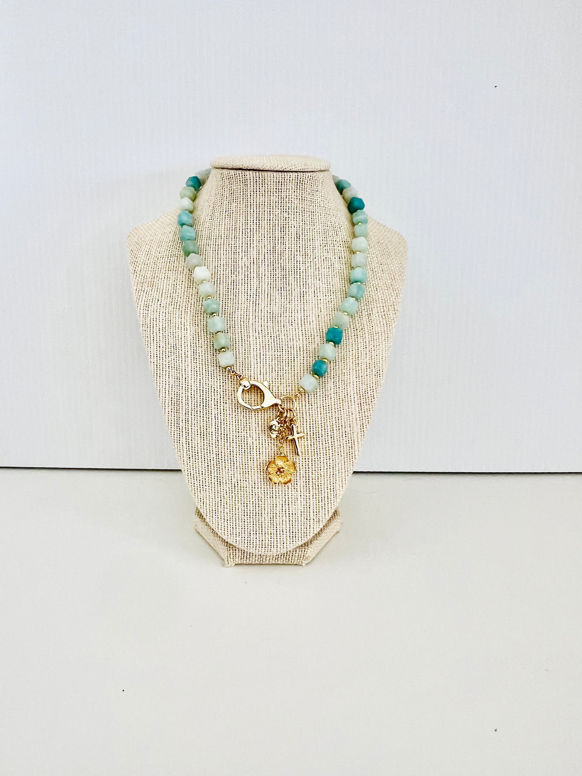 Fresh and soothing in tone, this amazonite beaded necklace features beautifully polished beads in soft aqua-green hues, creating a calm and elegant aesthetic. The natural variation in the stones adds depth and organic charm to the design.