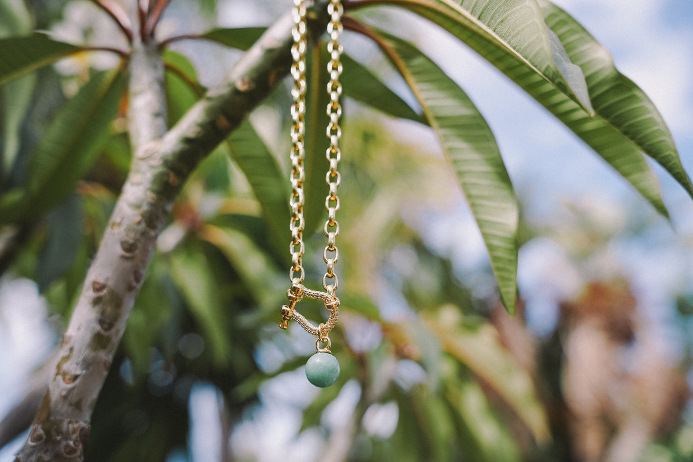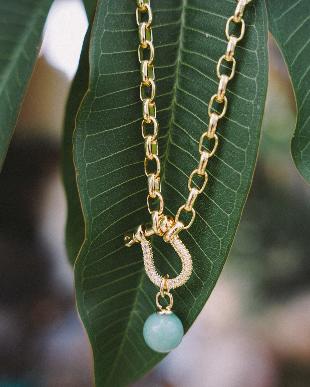 Gold plated belcher chain with diamanté horseshoe clasp and aventurine ball.