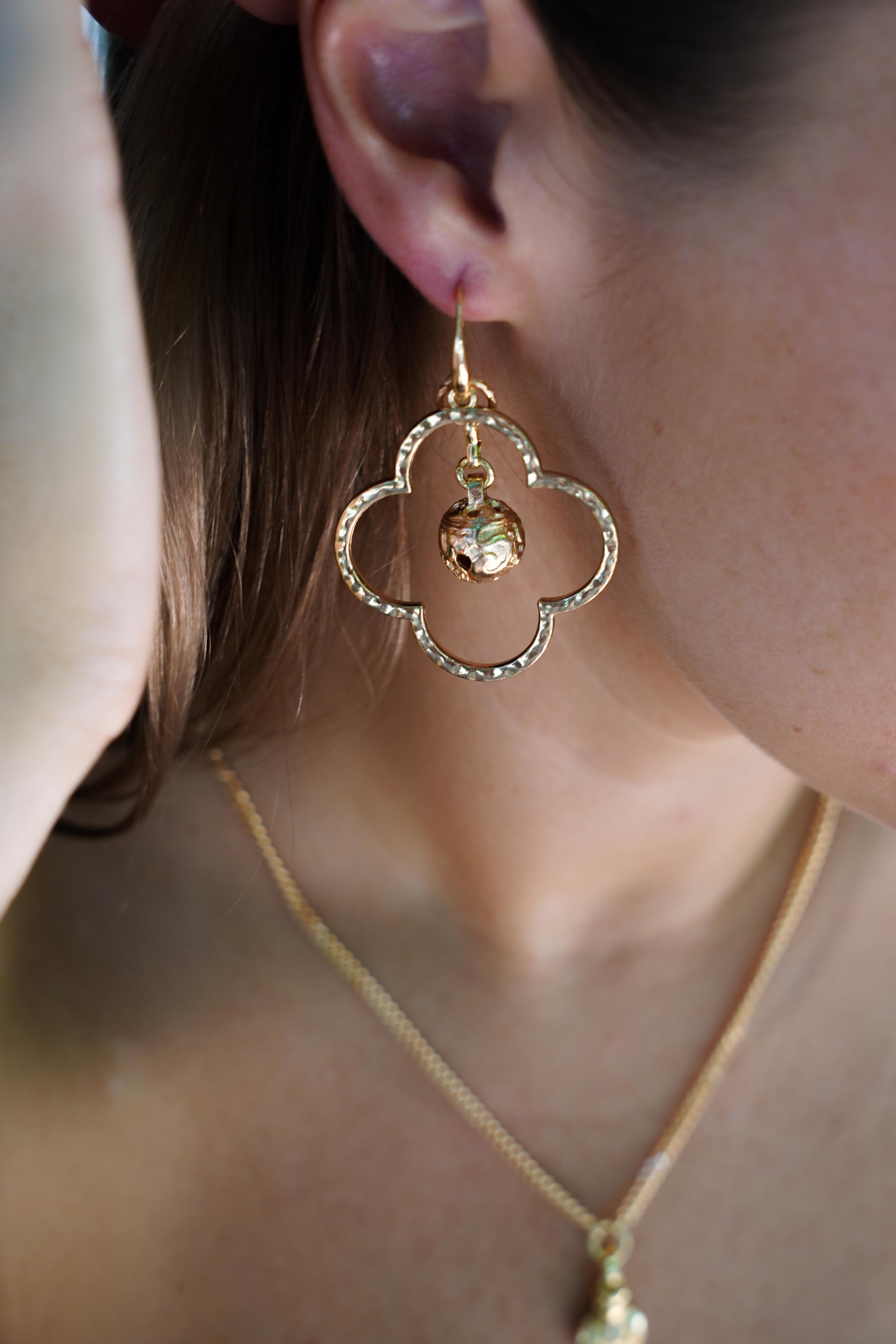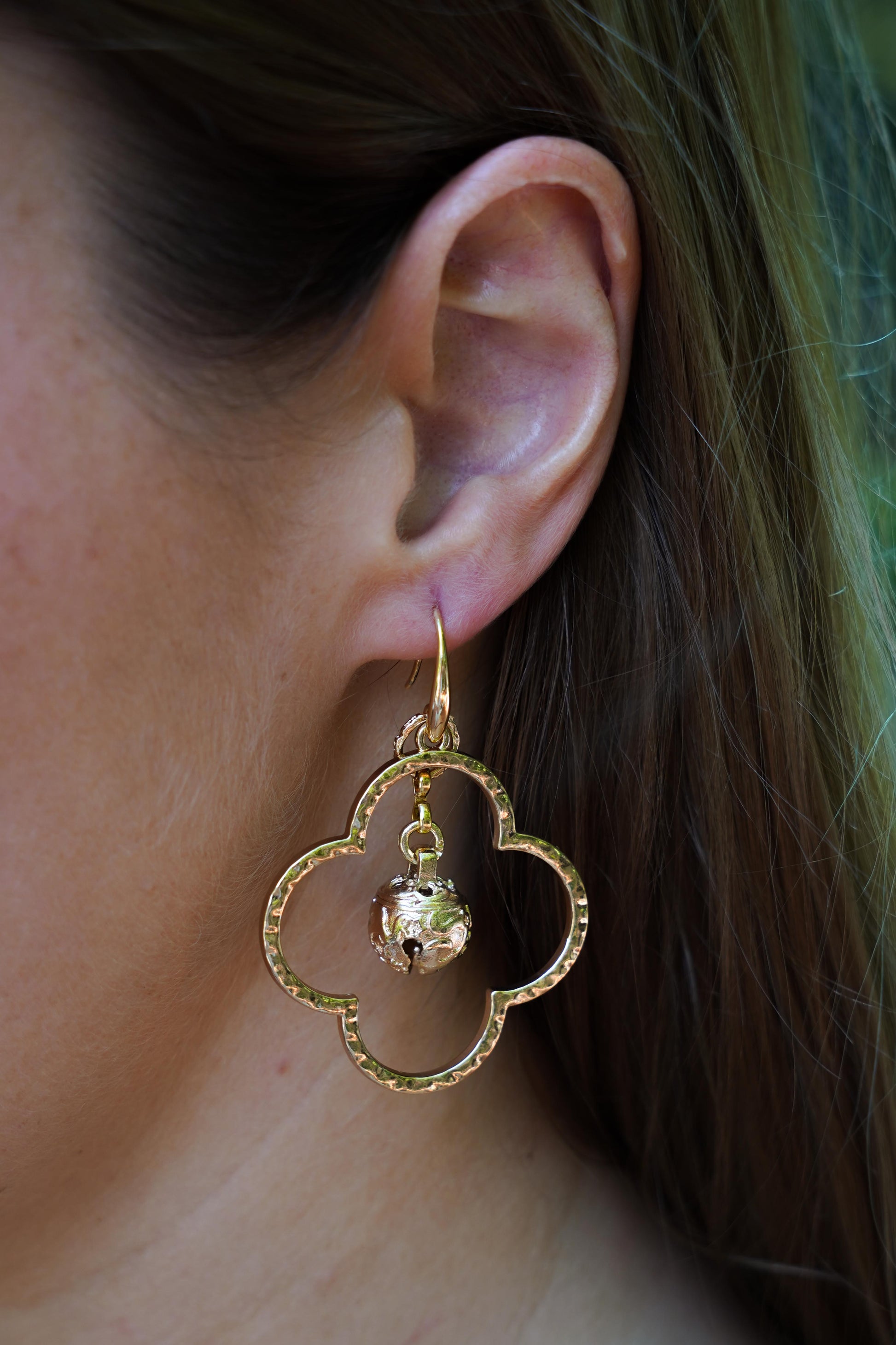 Featuring a 40mm hammered gold quatrefoil (clover) frame, each piece catches the light with subtle texture and dimension, creating a soft, radiant shimmer with every movement. Suspended at the center is a 12mm bell-shaped accent, finished in 14k gold plating, adding a delicate focal point and a hint of playful sophistication.