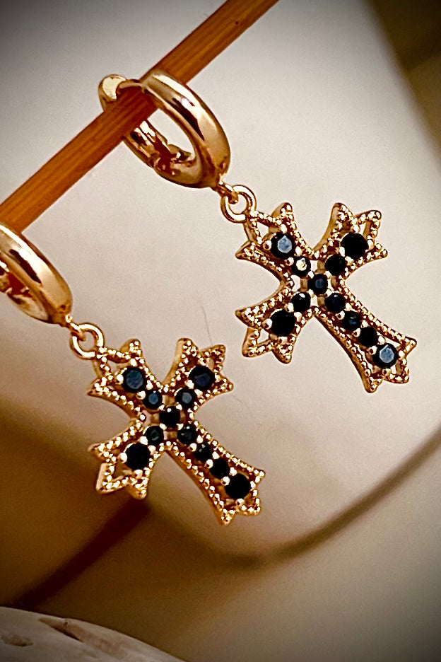 14km Gold plated huggies with black 18K Gold Filled Micropavé CZ Cross