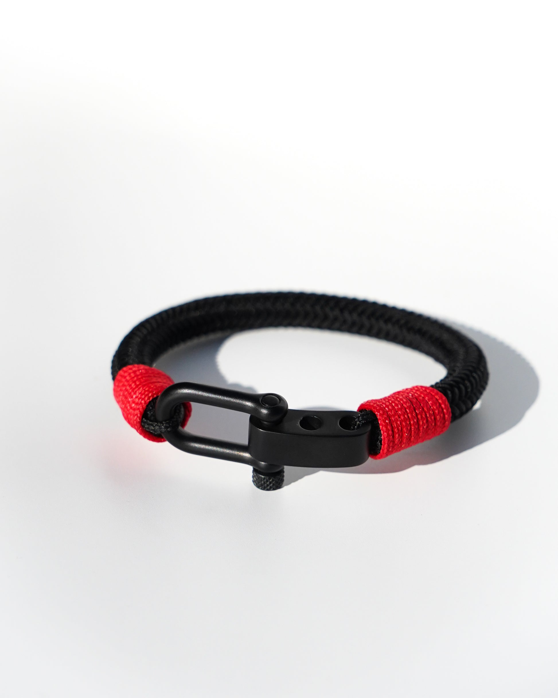 Stainless steel adjustable black rope bracelet with red wrap feature.