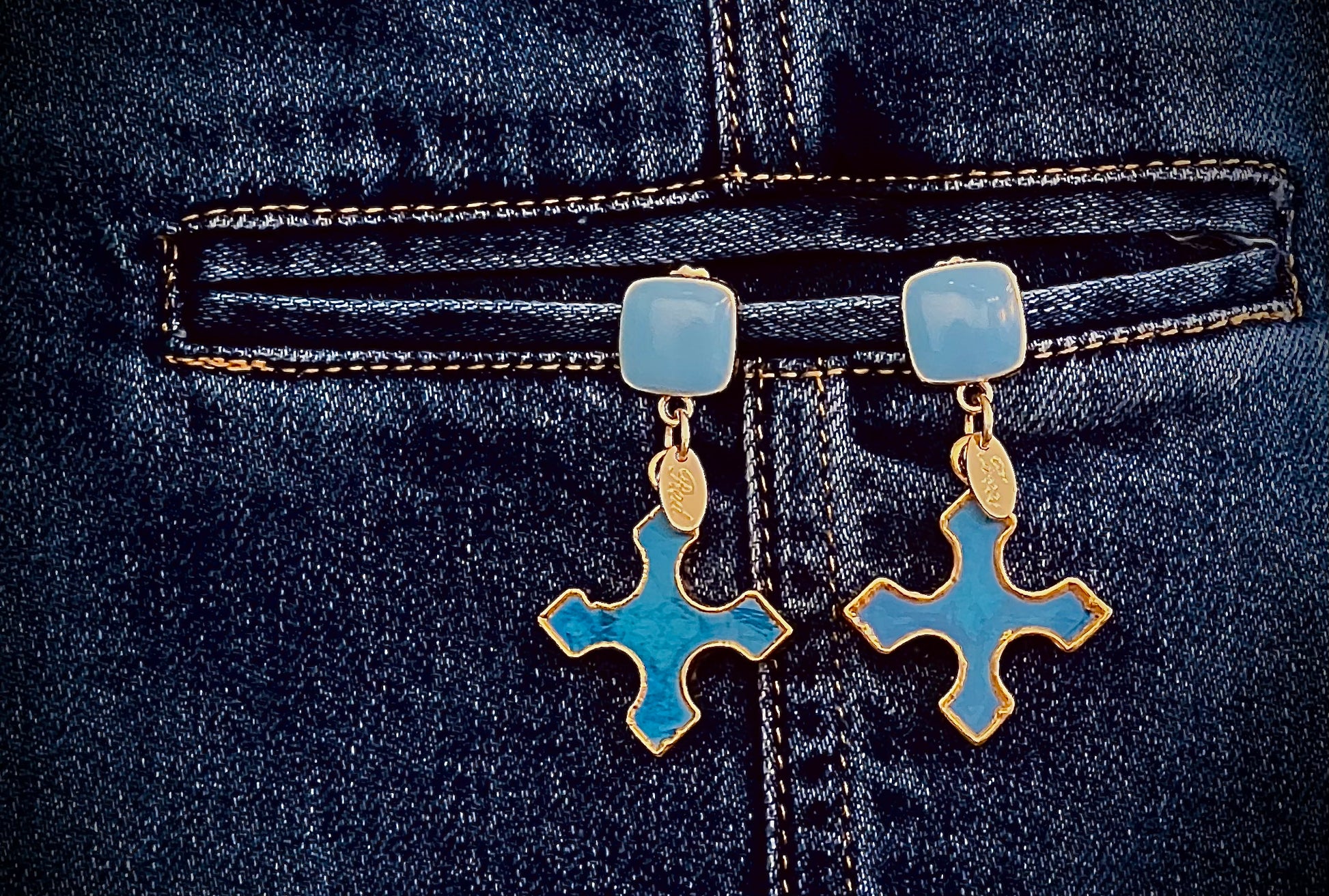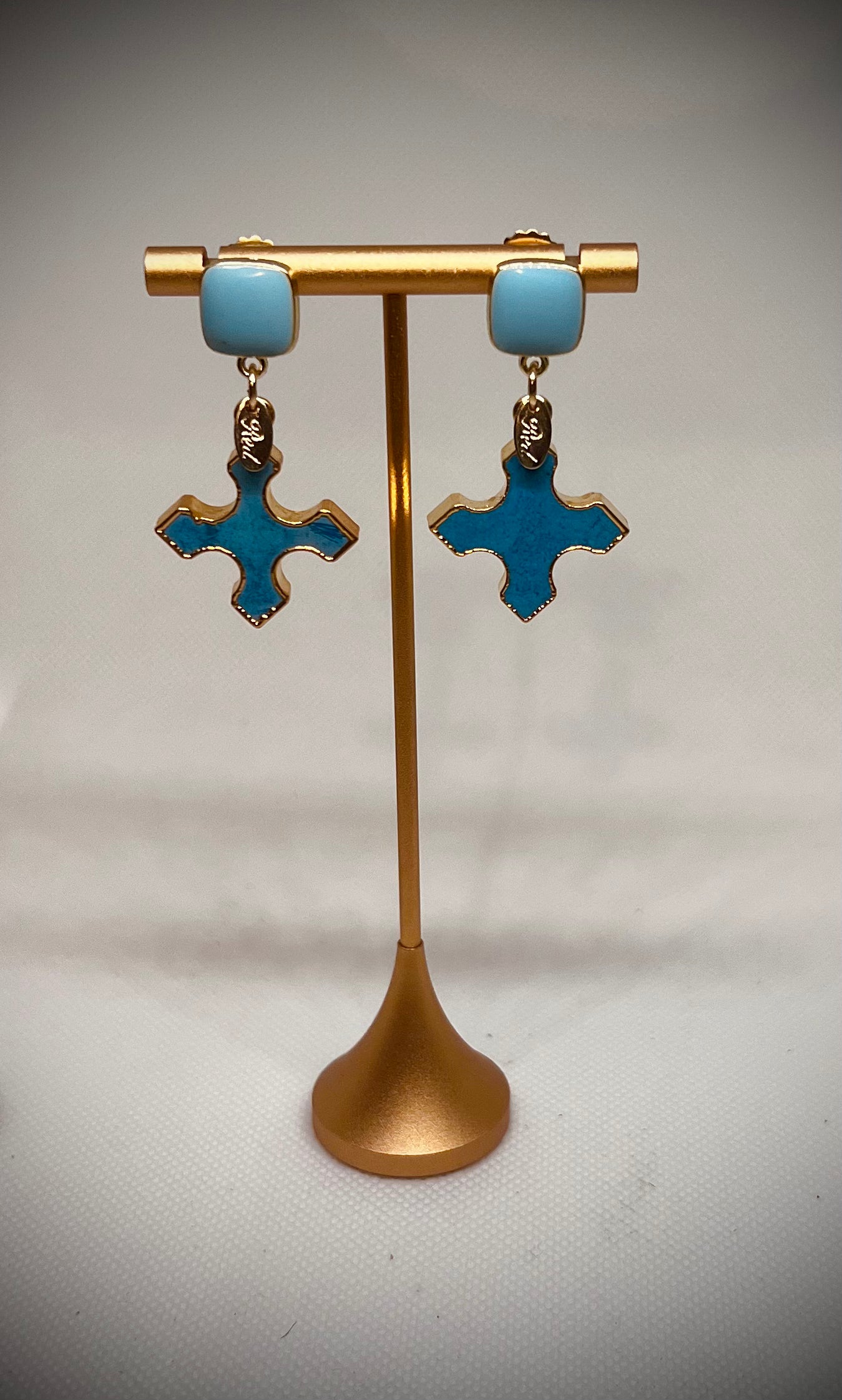 Blue Enamel square post with turquoise 29x25mm Medieval Cross.
