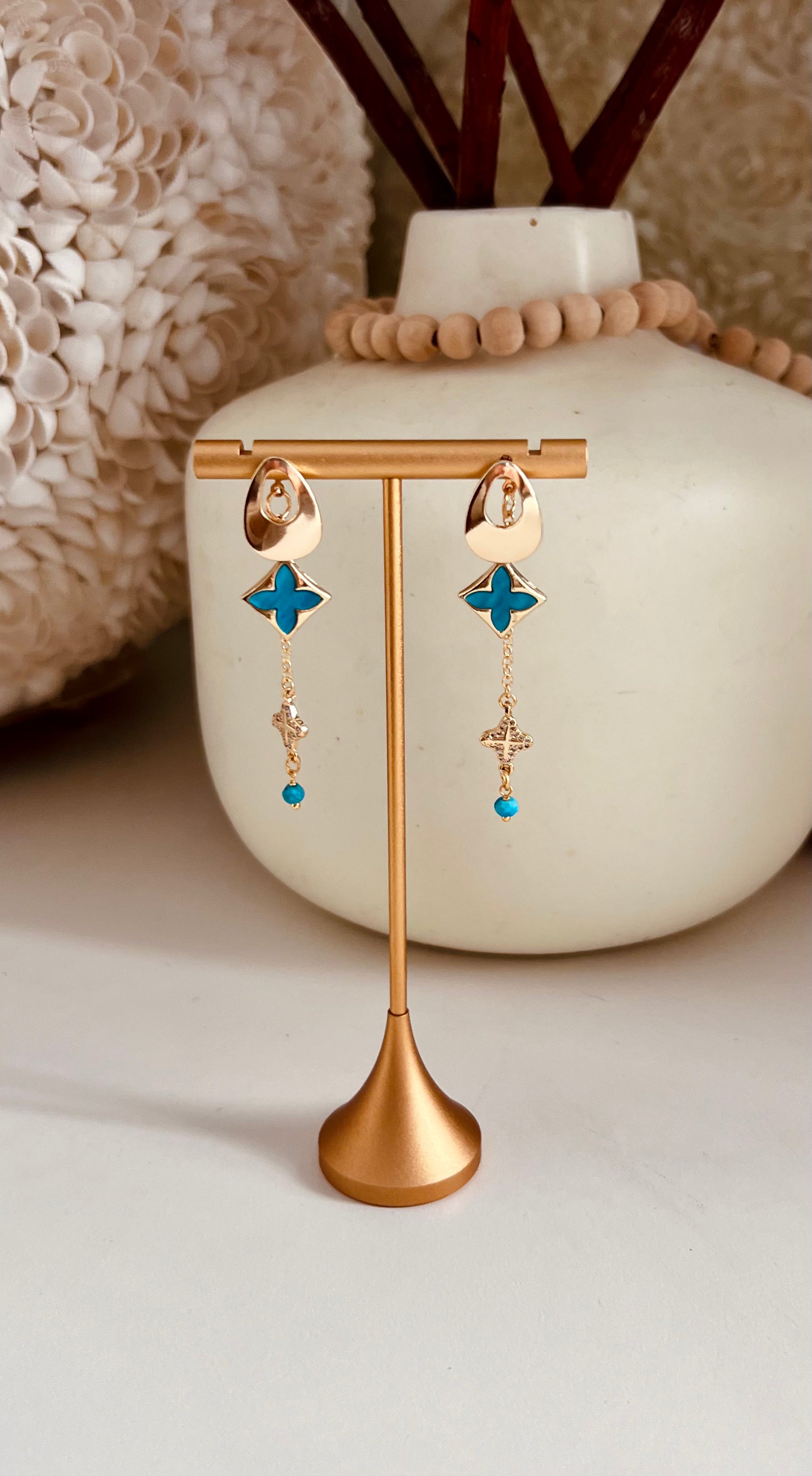 18k gold plated teardrop post with blue clover charm and a chain with CZ and turquoise bead drop