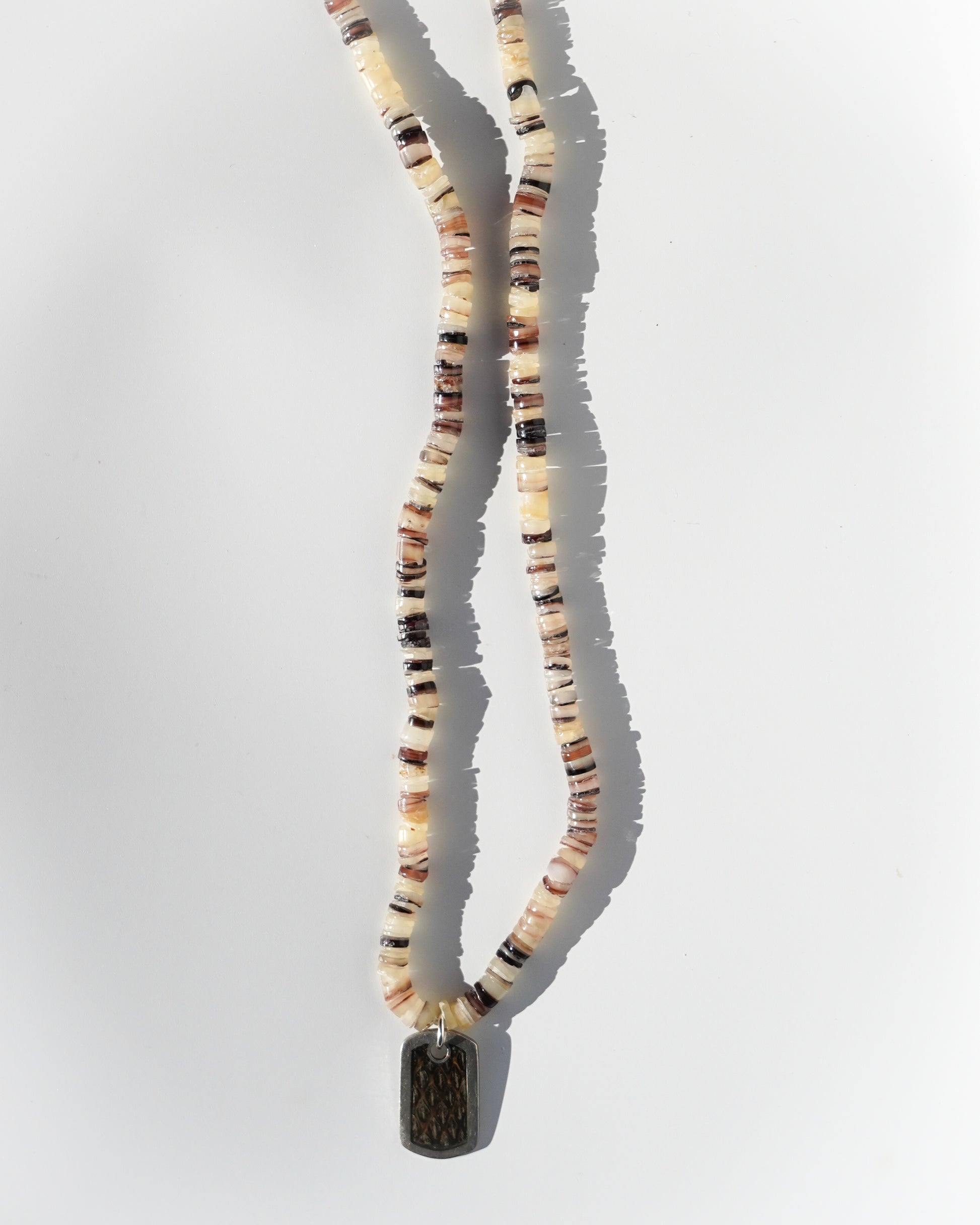 18 inch seashell and coconut shell necklace with snake snake skin sterling silver tag