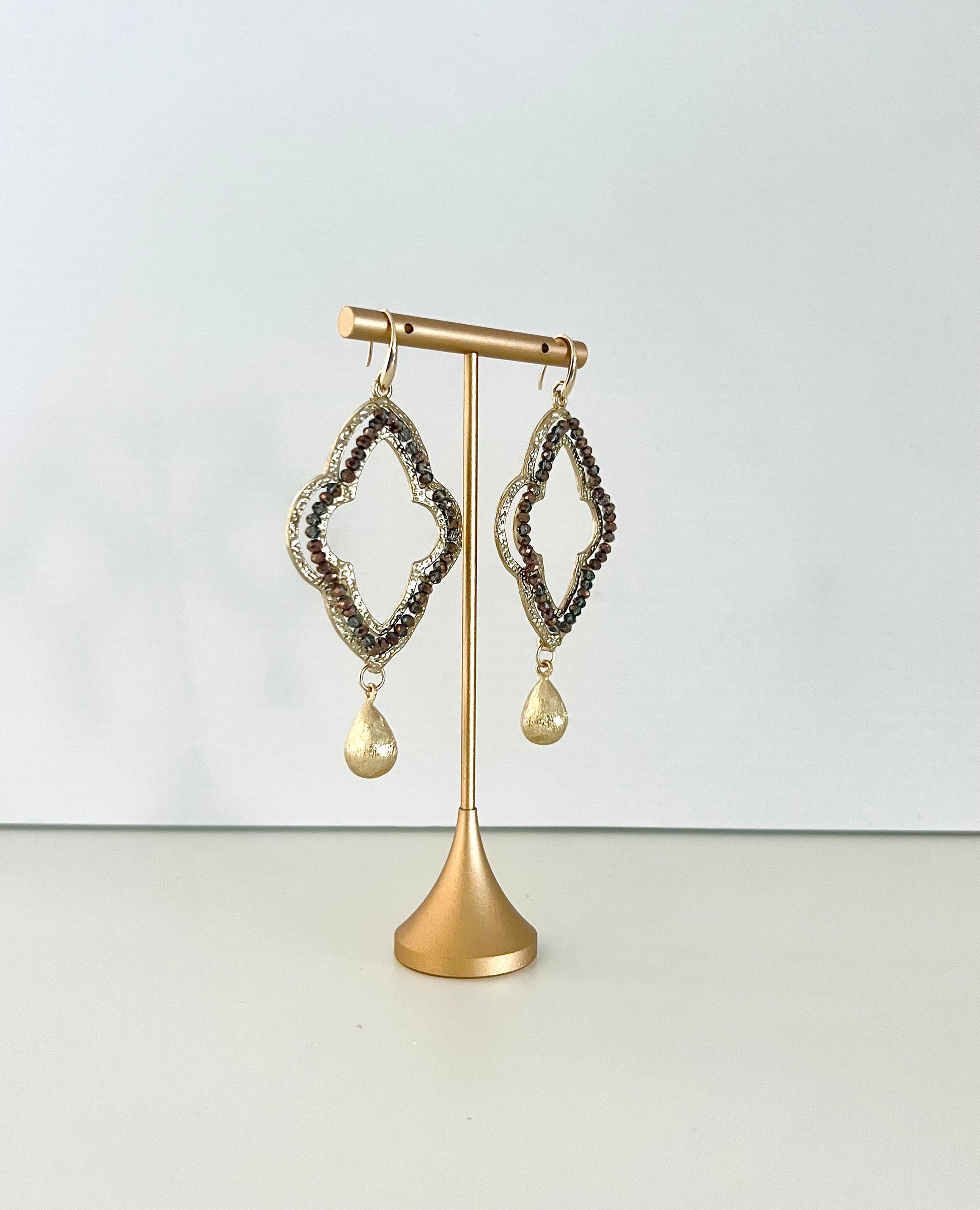 Gold plated frame with bronze coloured beads (approx 57mm long) and a resin diamanté ball drop