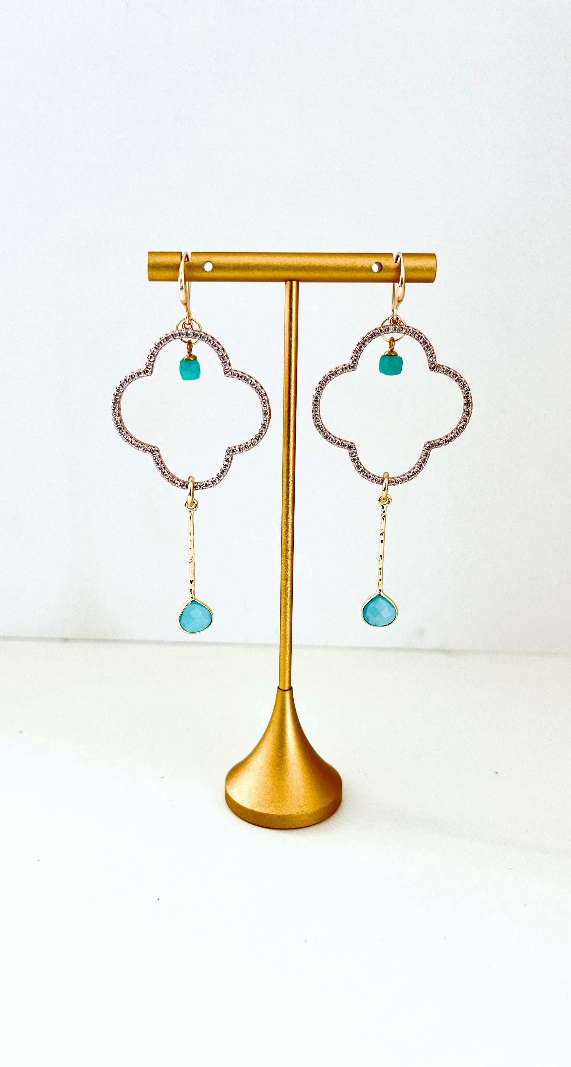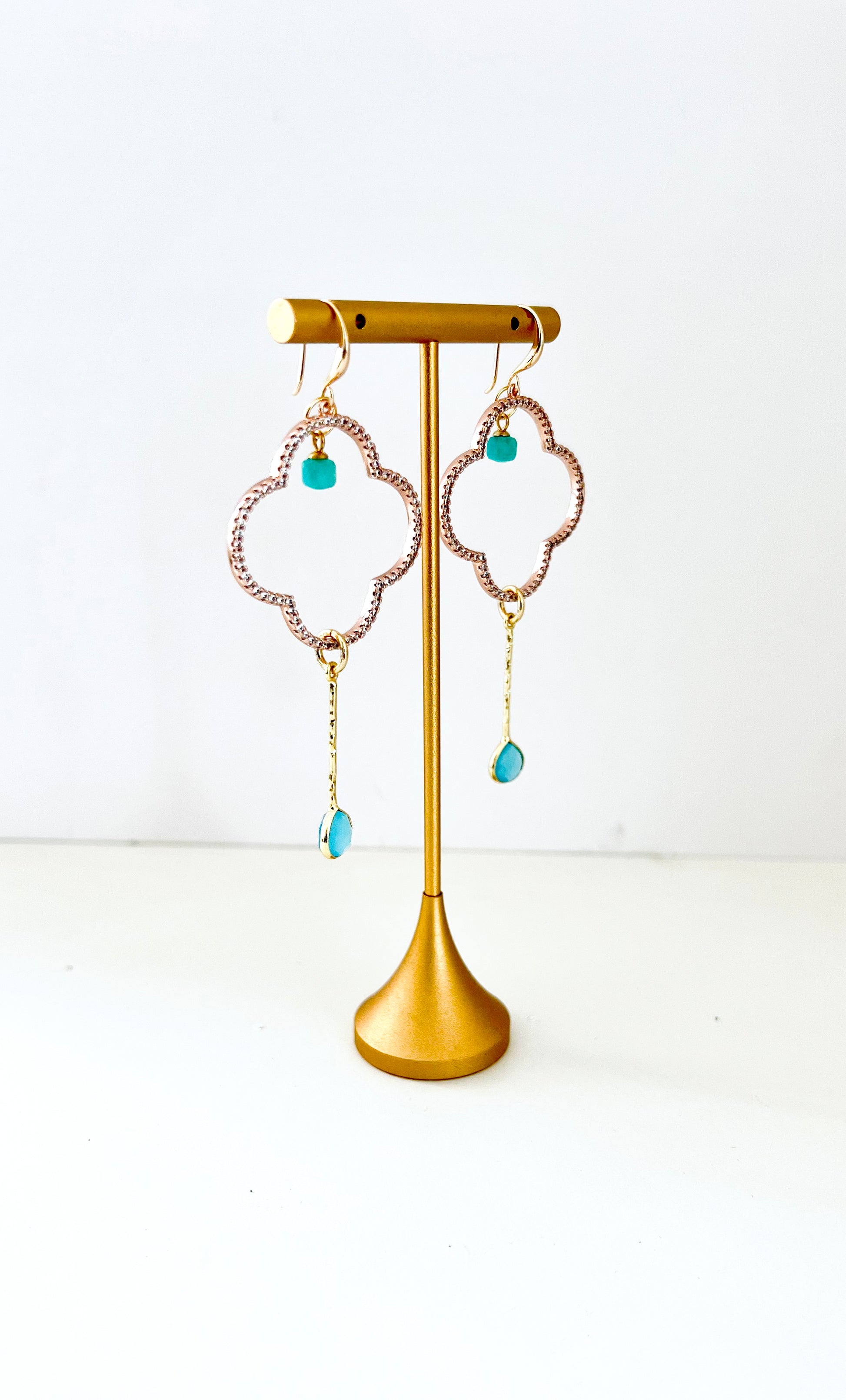 Cubic zirconia rose gold plated 37mm clover with blue bead and 30mm long bar with Peru blue chalcedony gem