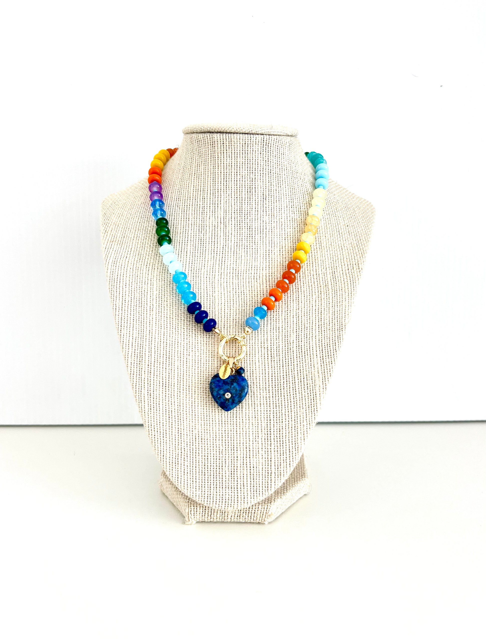 Colour beaded necklace with 18k gold plated round front coast with cubic zirconia features. Navy heart charm