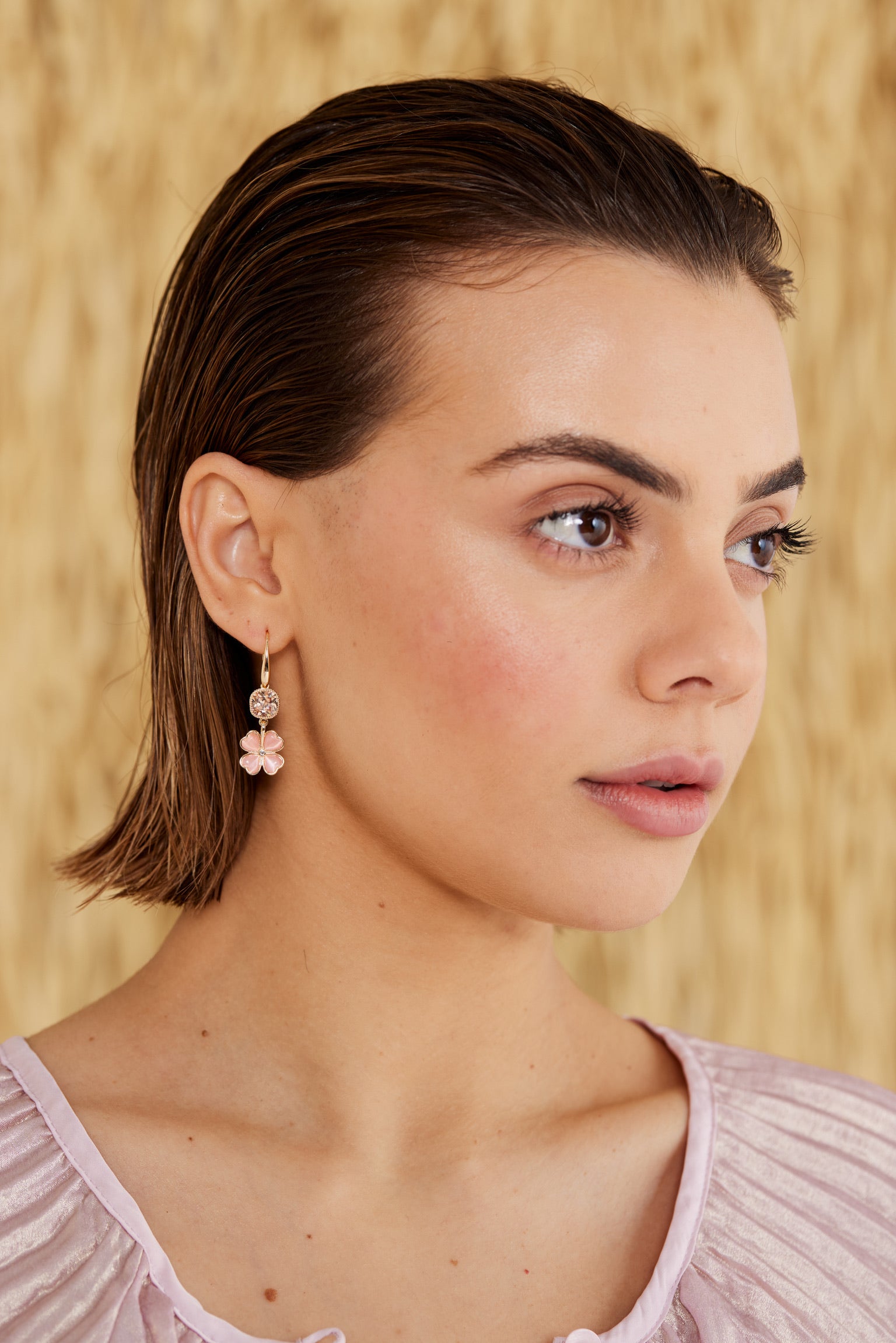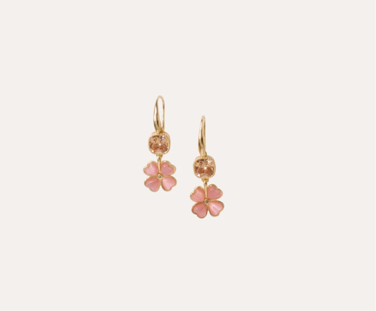 The Gabbi Kelly Flower Earring adds a subtle touch of pink to your spring look. It falls to a peach zircon gem and pink cat-eye stone-inlay clover.