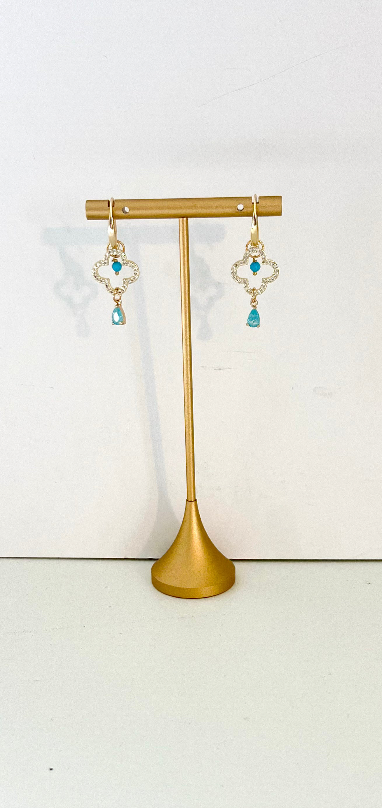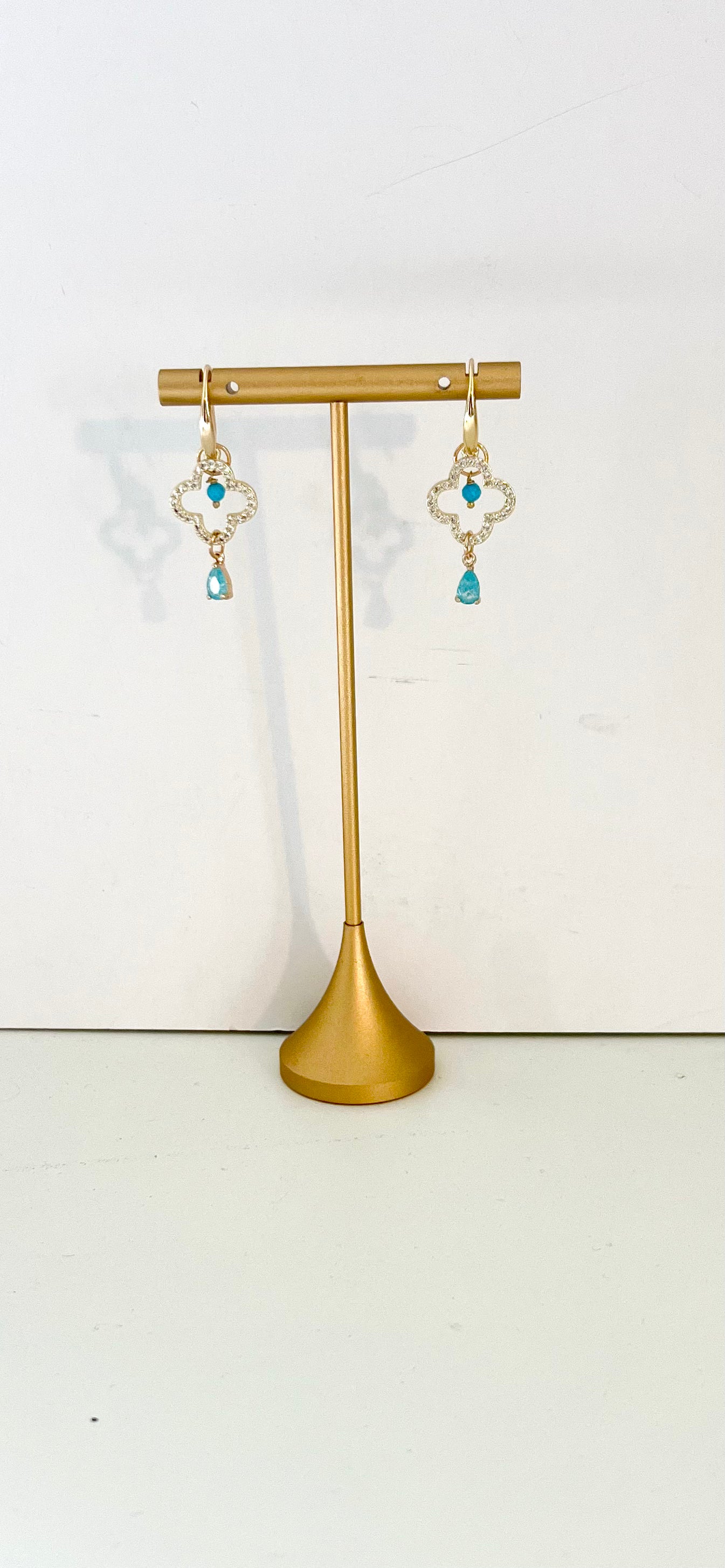 18k gold filled cubic zirconia clover 22mm x 16mm with with 5x7mm blue cubic zirconia teardrop and turquoise bead.