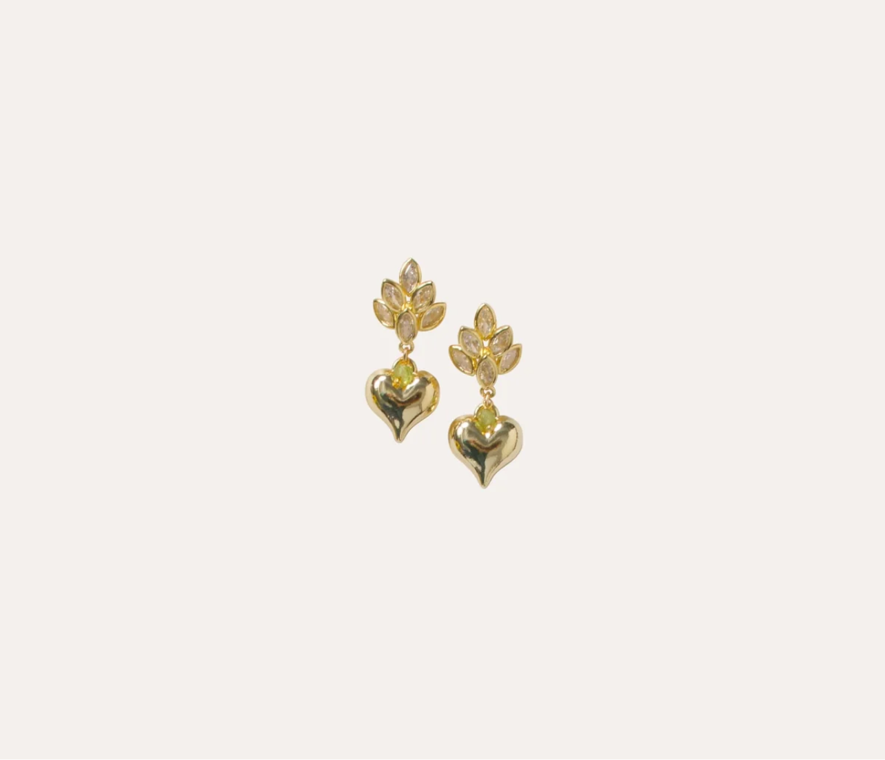 The Gabbi Kelly Leaf Heart Earring embodies a playful spring mood with its 18k gold plated CZ zircon lead stud post and heart charm. 11.5x15mm heart charm