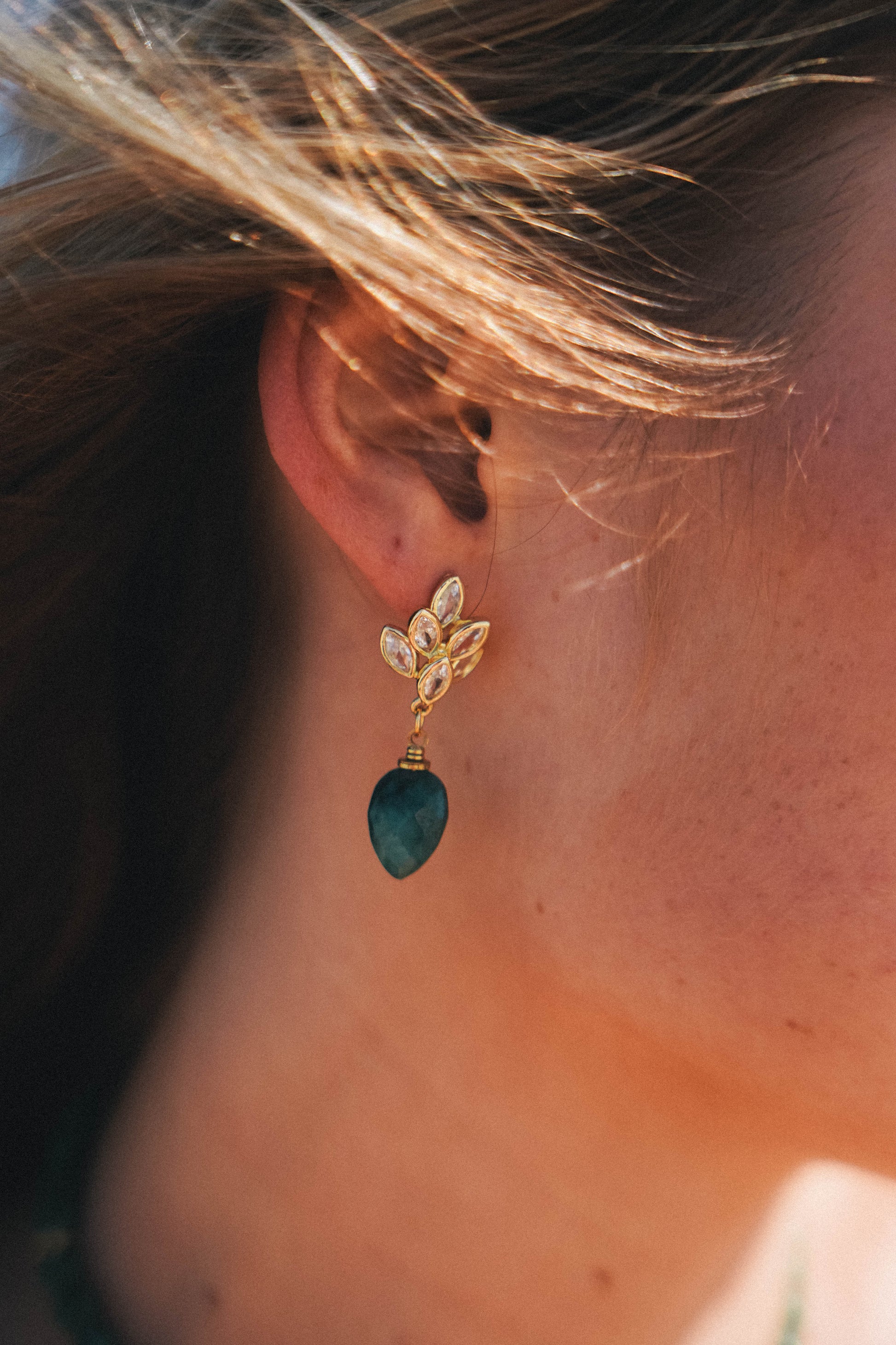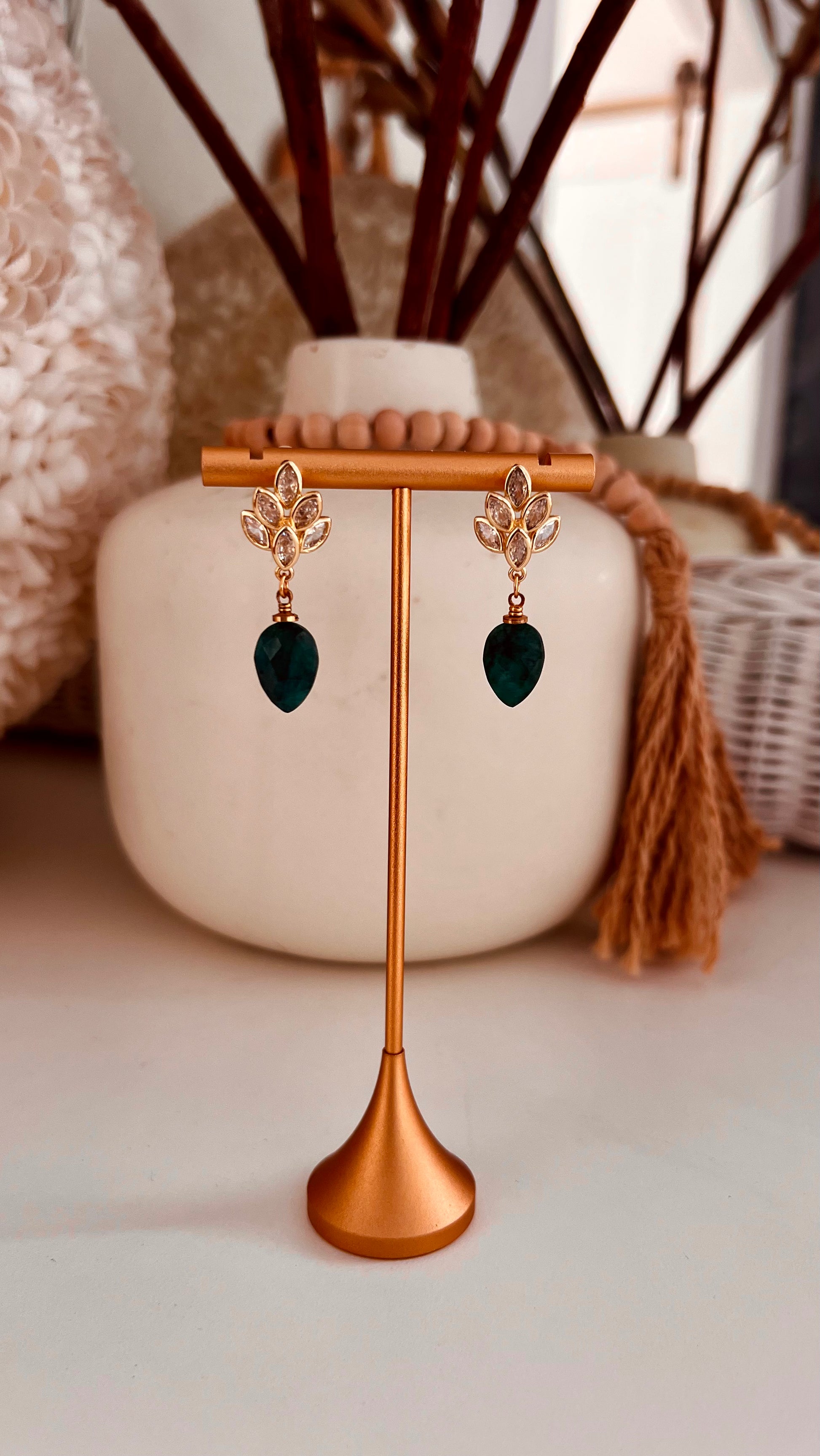 Gold plated CZ pave leaf post with 10x 14mm emerald teardrop pendant