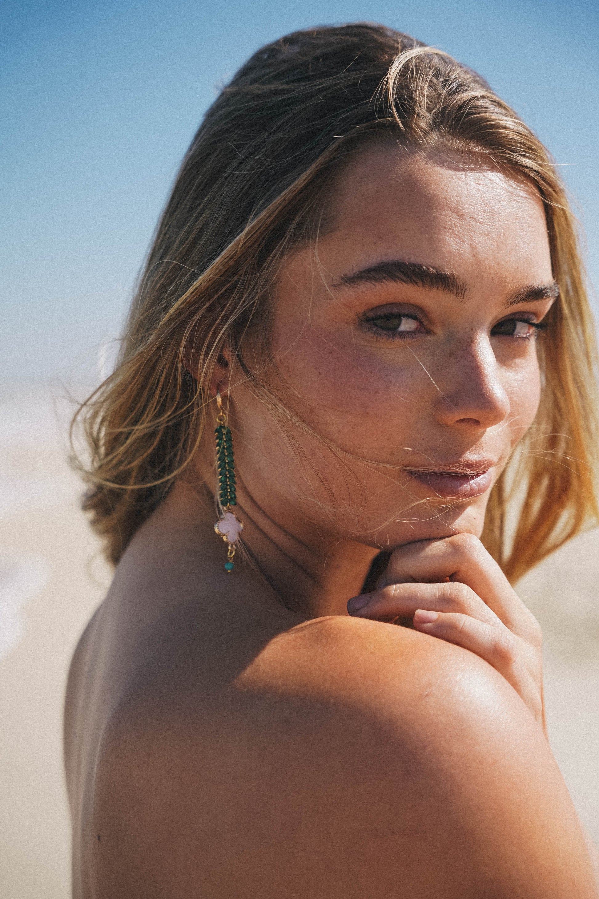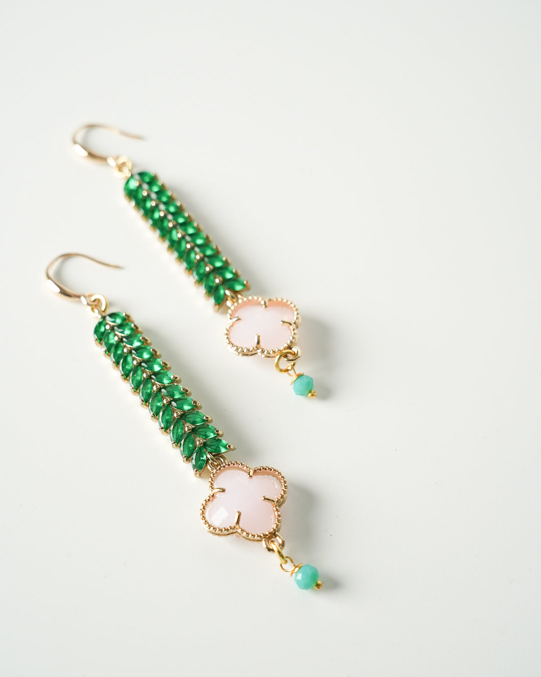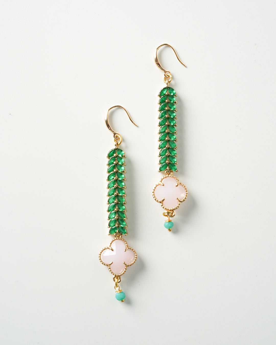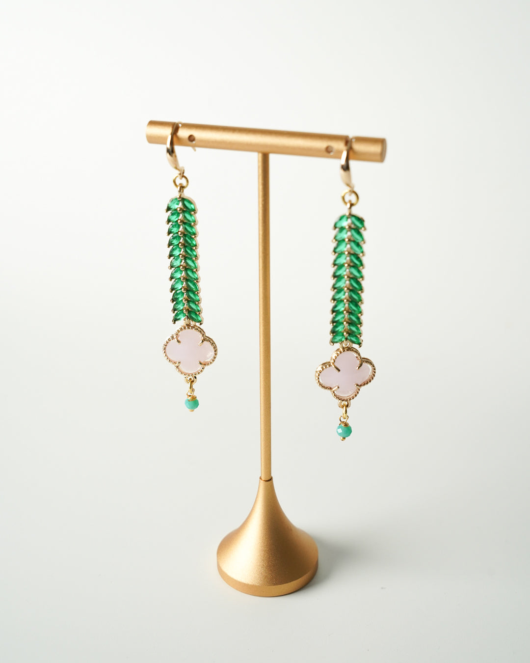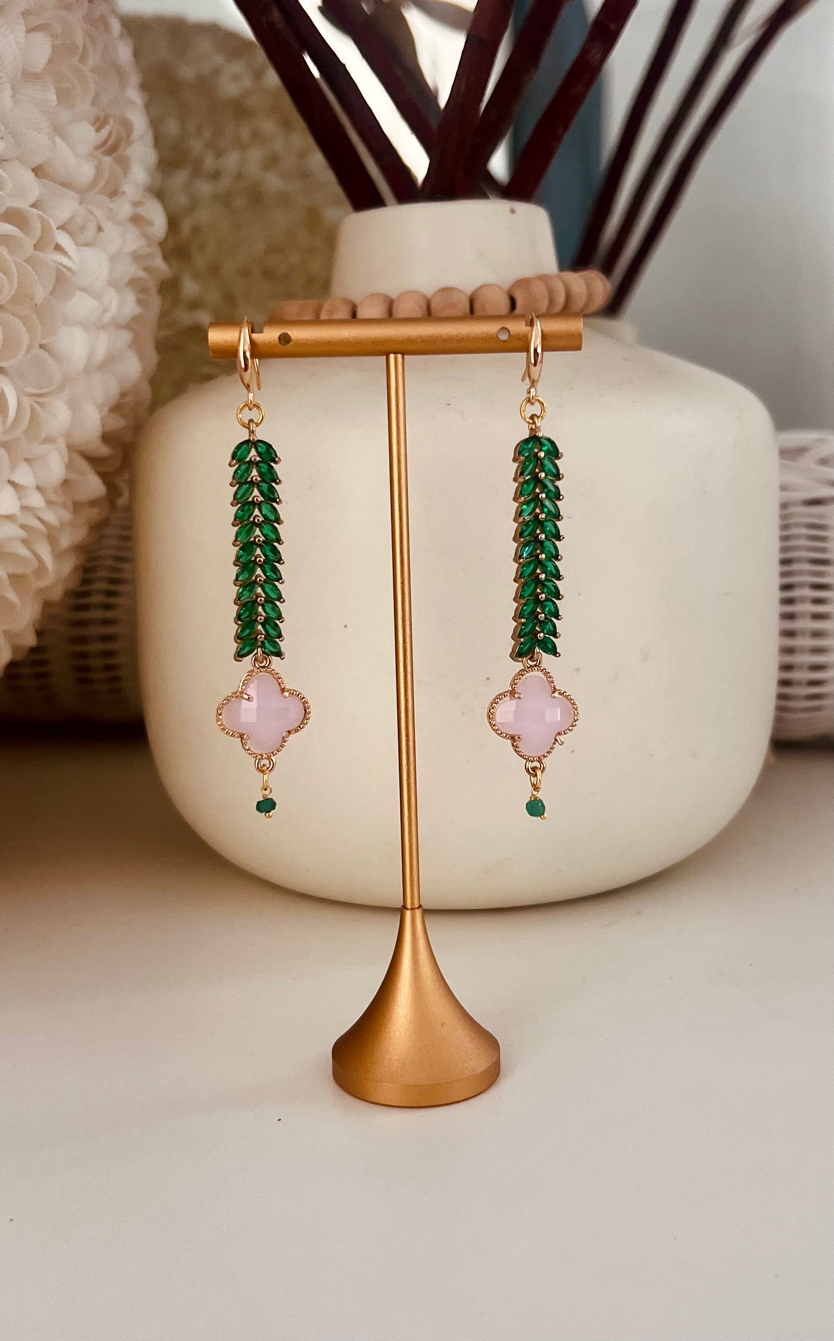 Leafy CZ pave leaf chain with rose quartz clover and green bead