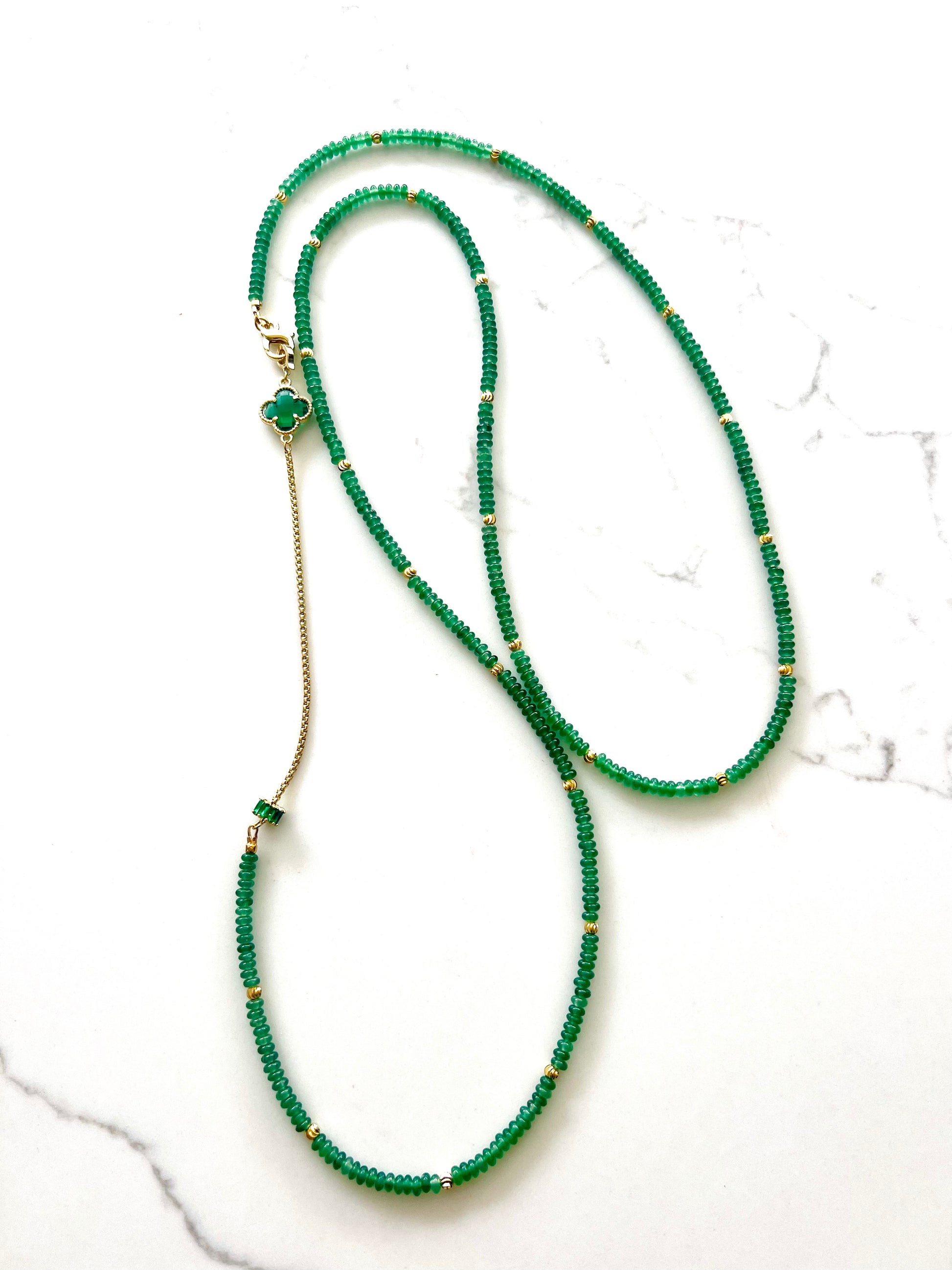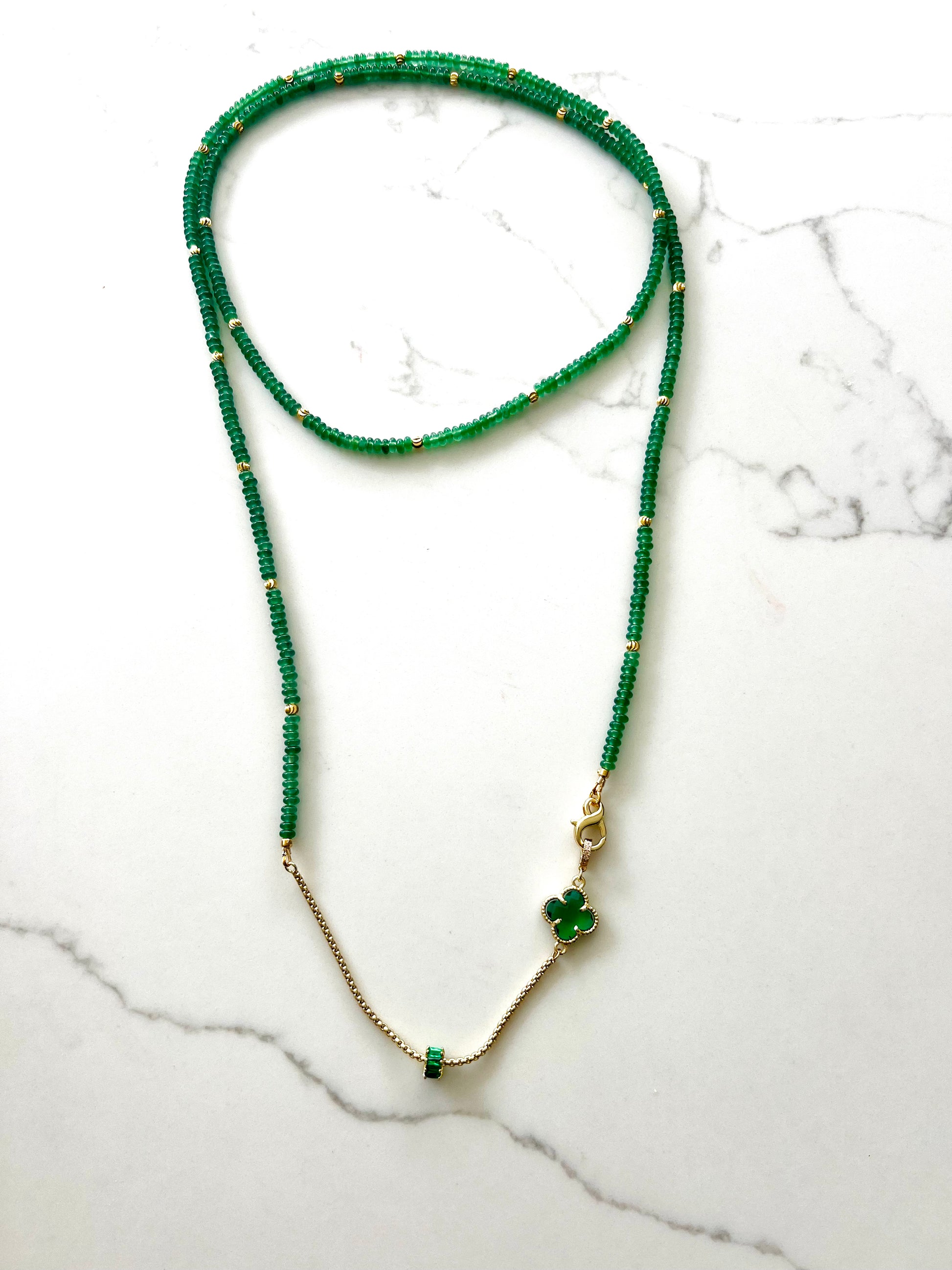 Accented with an 18k gold-plated chain detail, the piece is beautifully finished with a delicate green amethyst clover feature, adding a soft, luminous contrast to the deeper green aventurine beads.