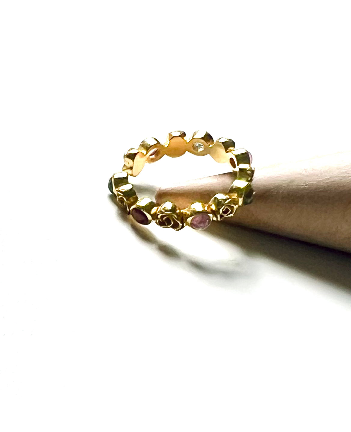 925 stirling silver with 1 micron gold plate ecoating Multi coloured tourmaline stone with rose features adjustable ring.