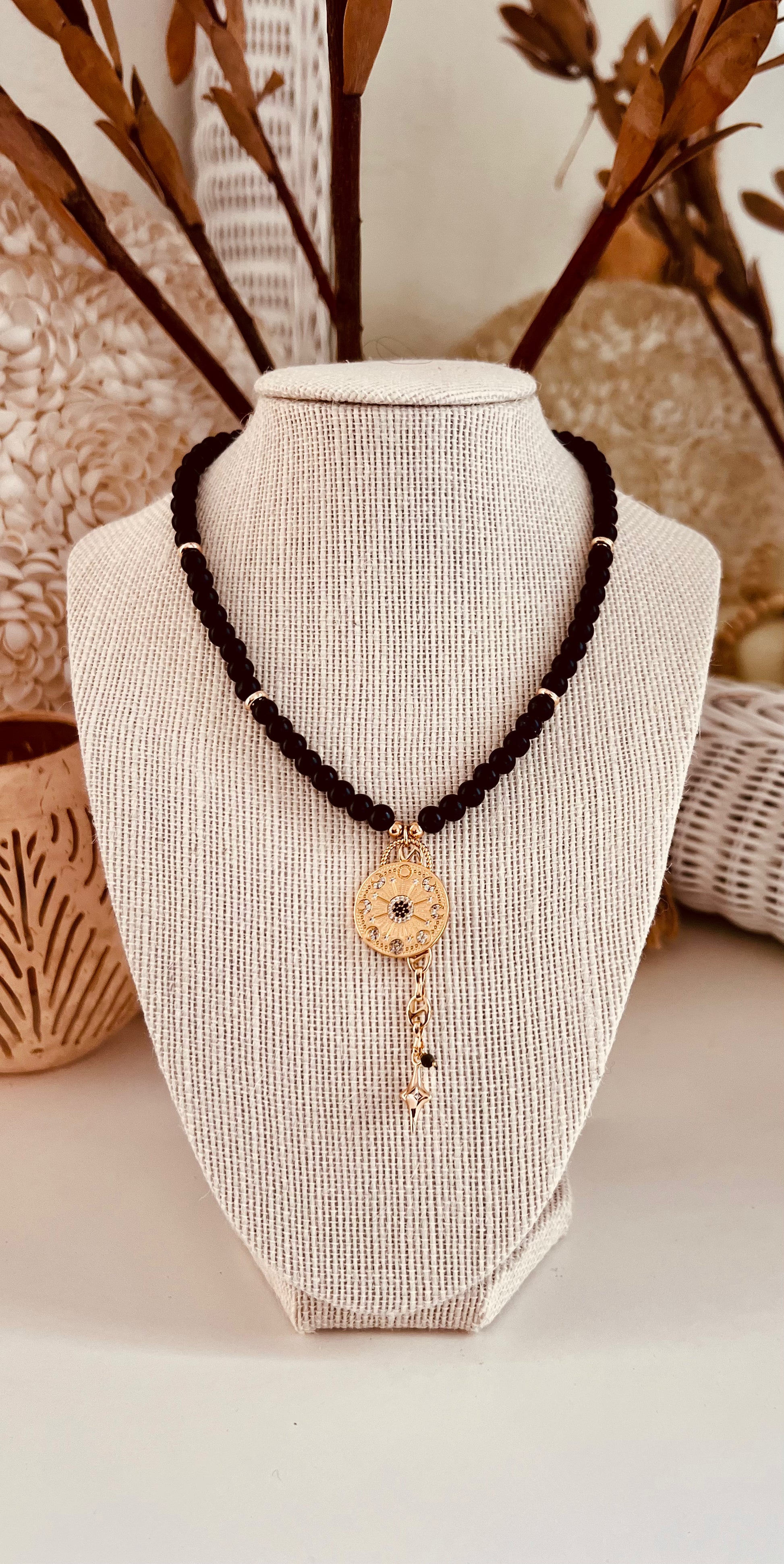 Black Onyx beaded necklace with gold plated CZ coin feature