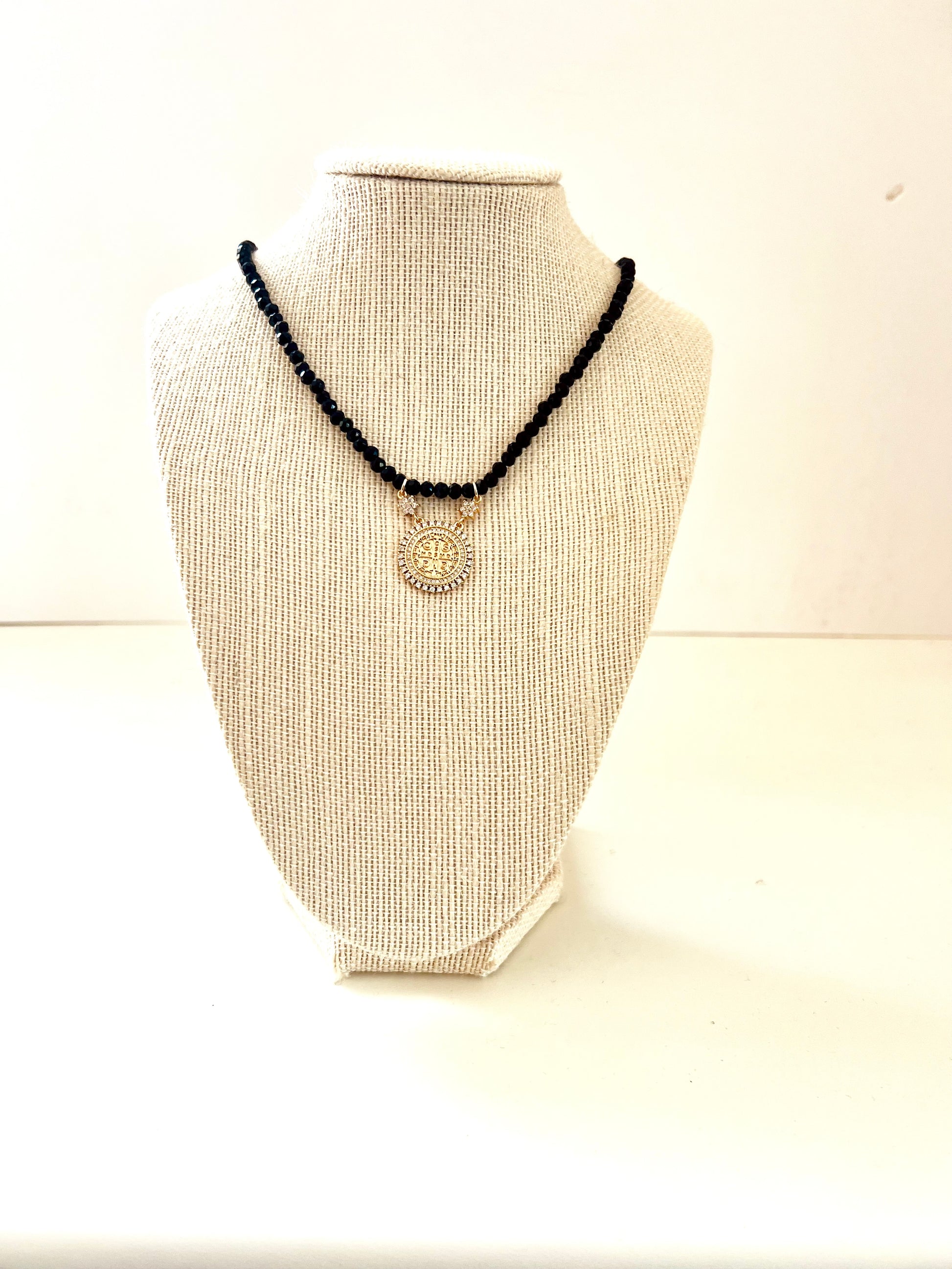 16 inch onyx beaded necklace with cubic zirconia pave coin