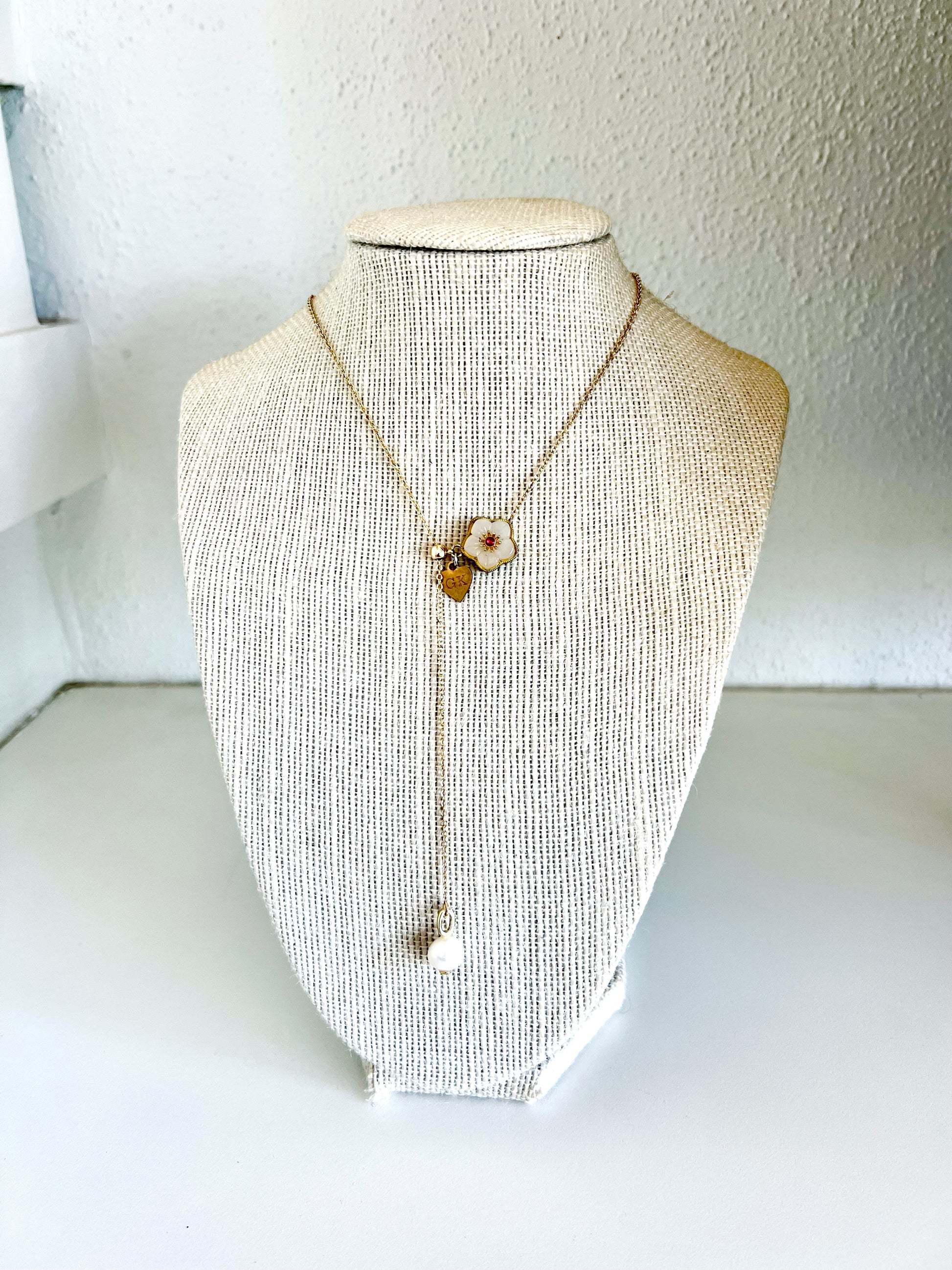 Gold plated resin flower on an adjustable gold 18k gold plated chain with pearl drop.