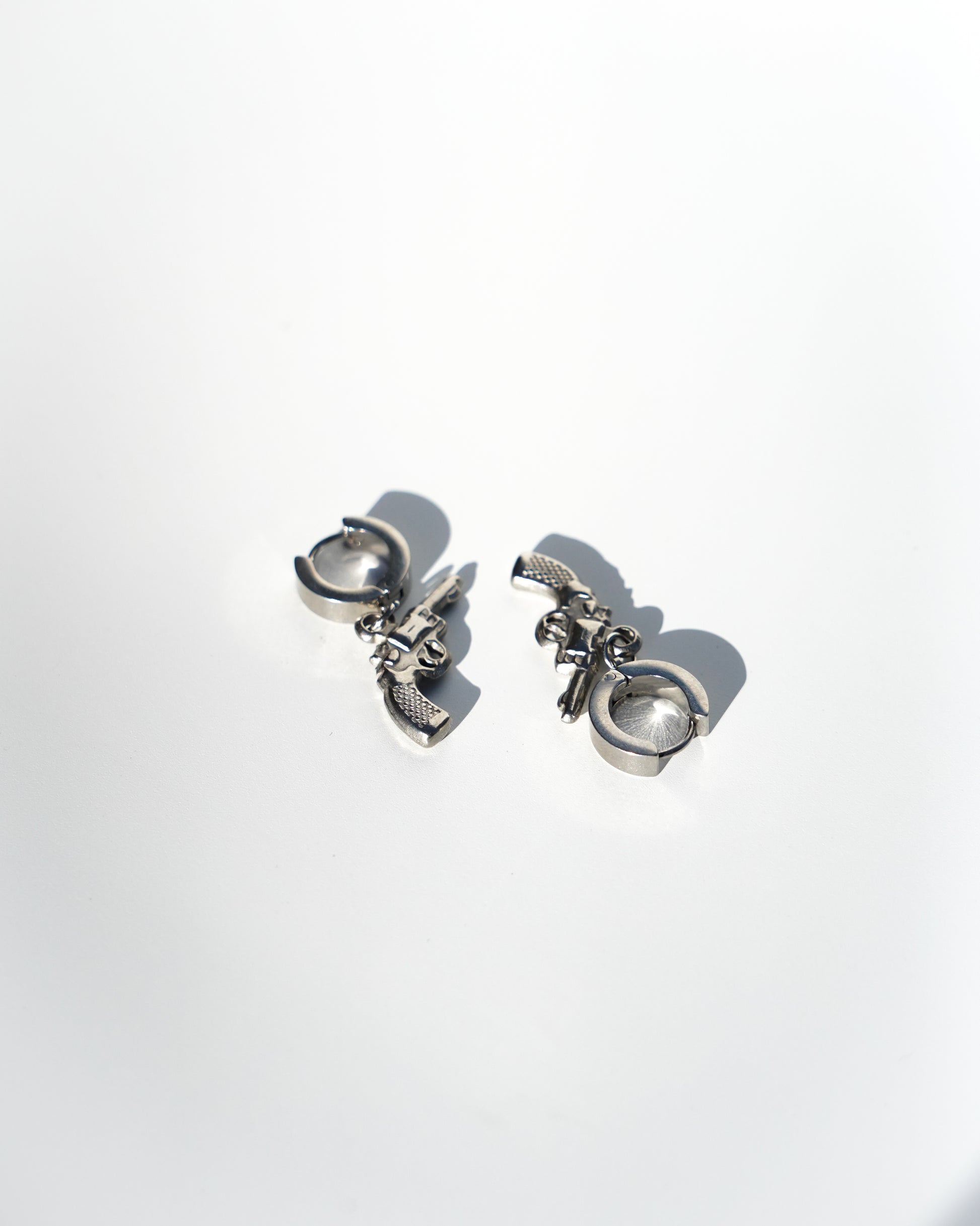 stainless steel huggie with pistol charm. Sold individually.