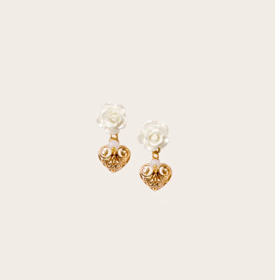 Rose Heart Earring adds a touch of romance to your spring look with its white resin rose and ornate filigree heart.