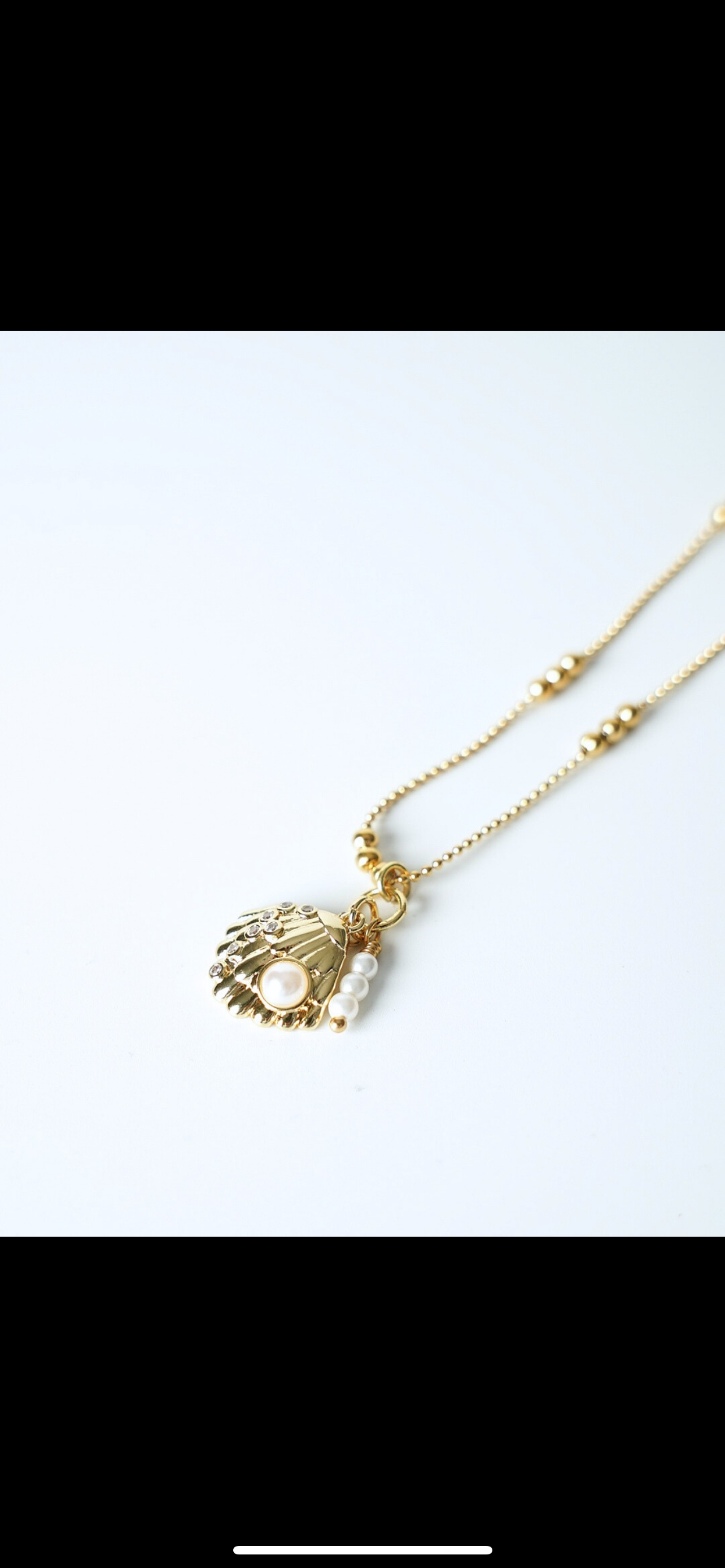18k gold plated Shell charm necklace with pearl features 16” long chain with extension
