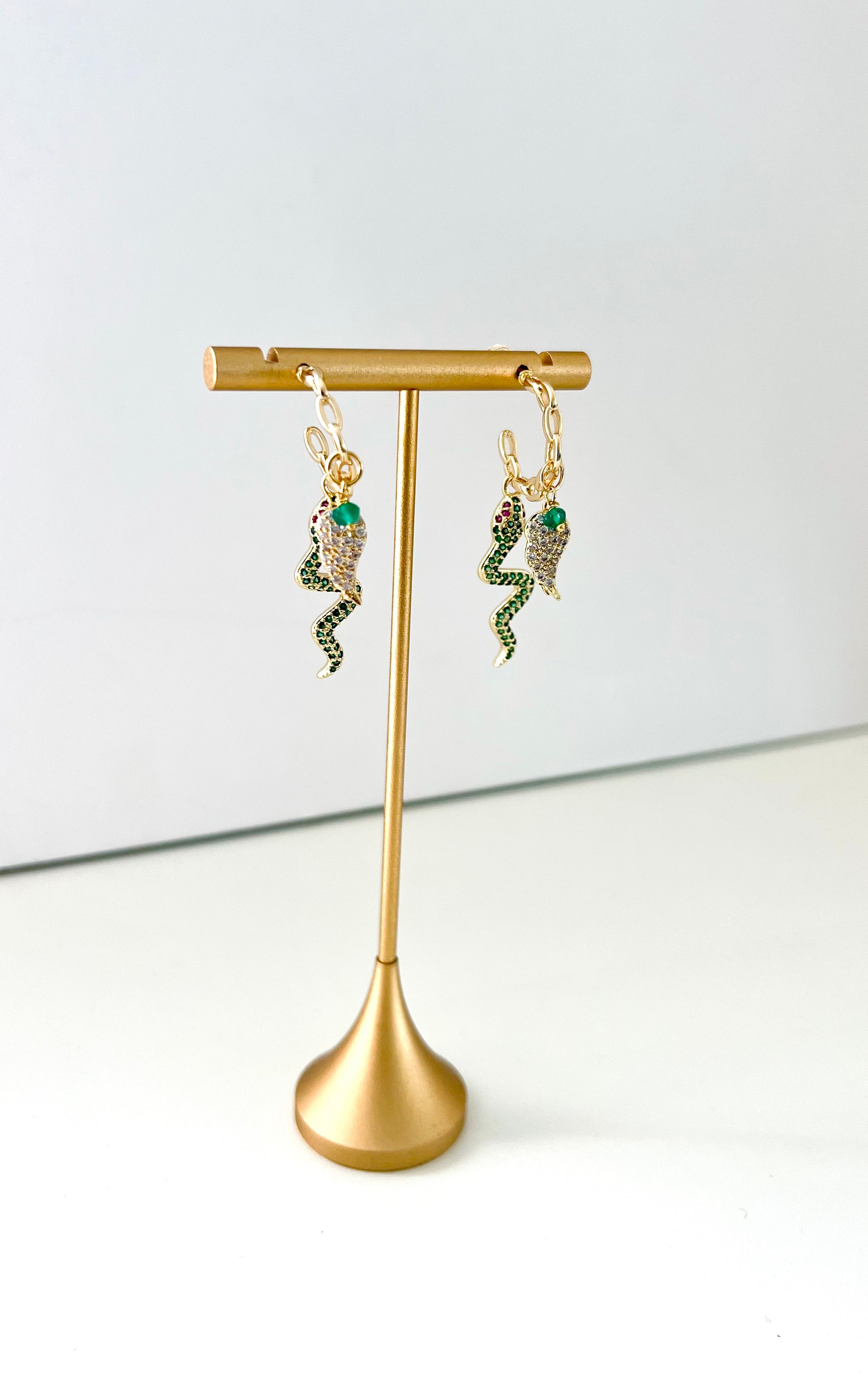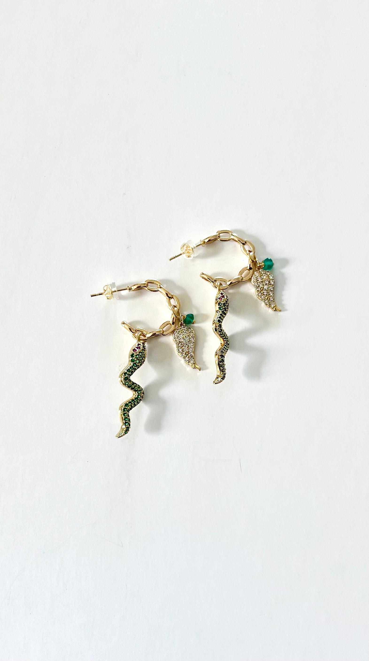 18k gold plated chain hoop with green cubic zirconias, snake and wing features