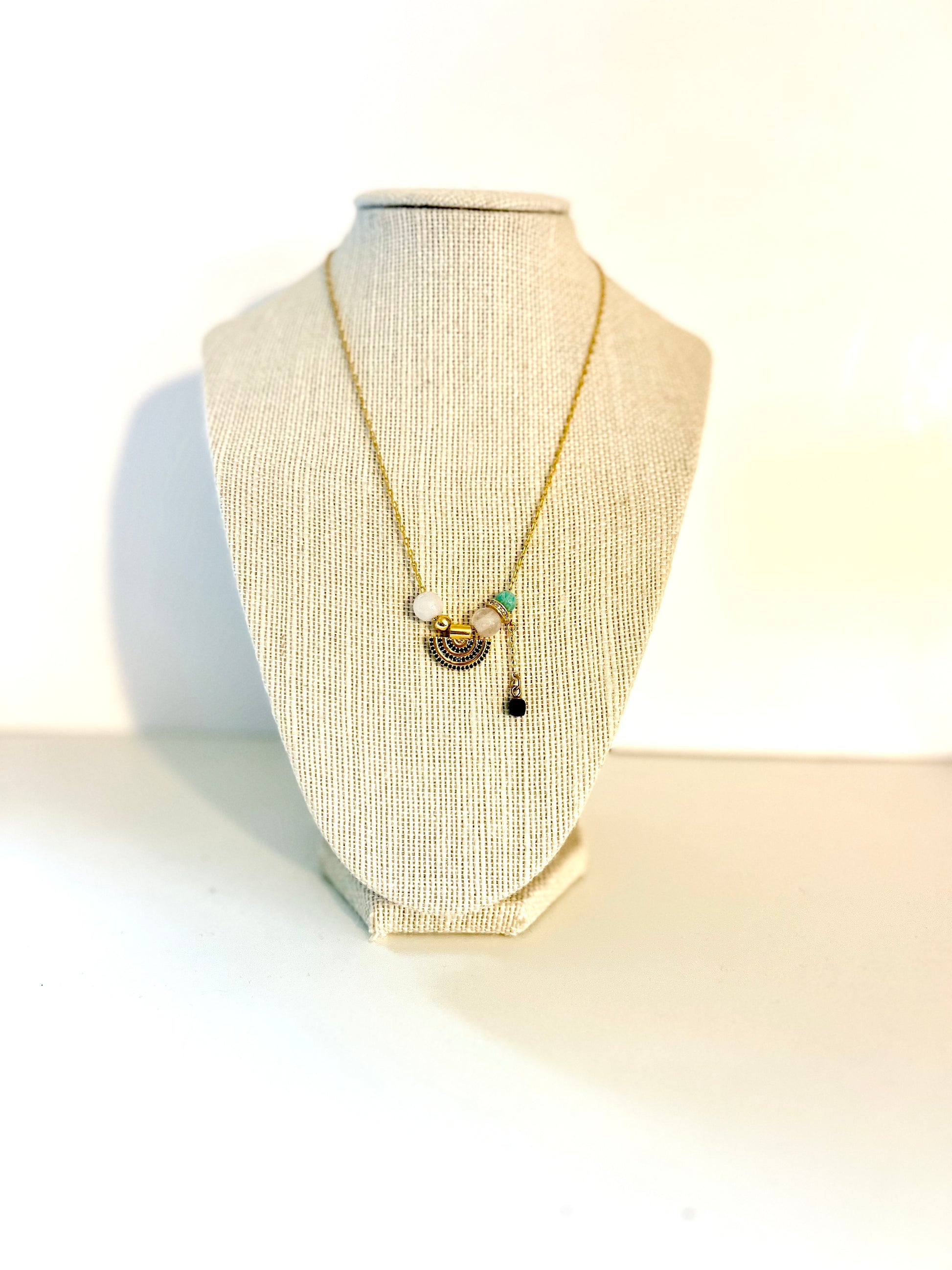 18k Matt Gold plated chain with semi precious stone beads and 13mm x 18mm micro pave cubic zirconia semi circle.