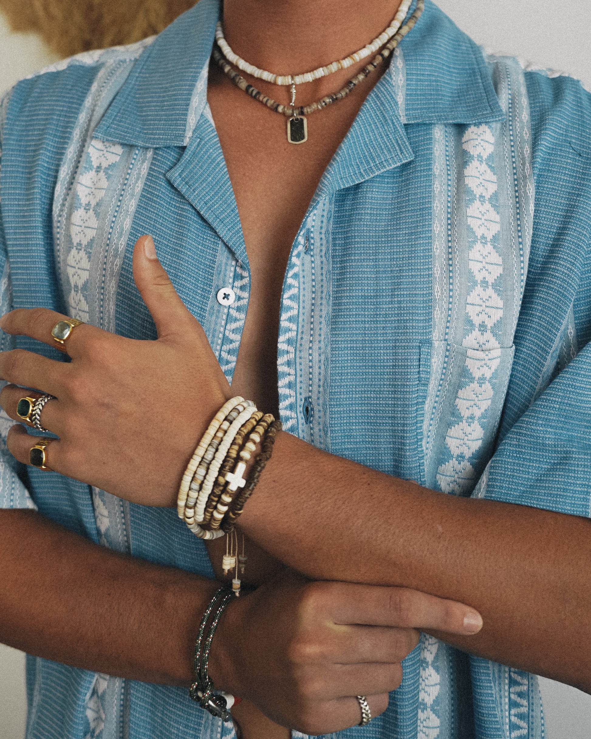 3 x coconut shell and wood beaded bracelets with a cross feature on elastic. Sold together