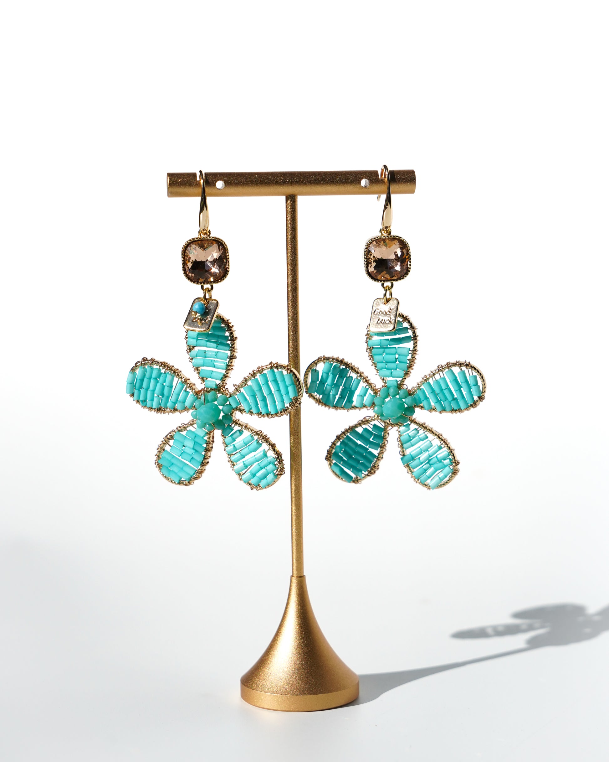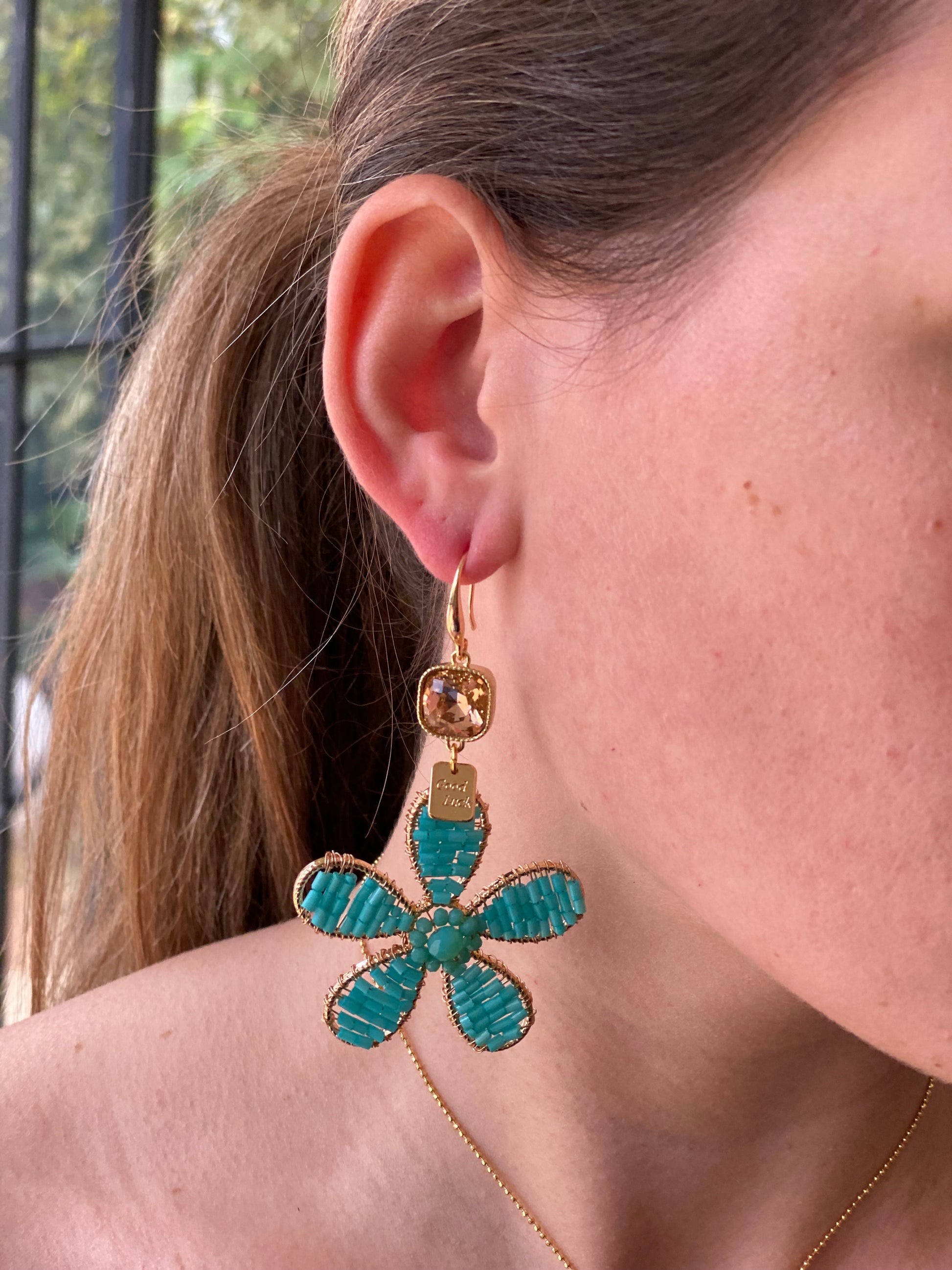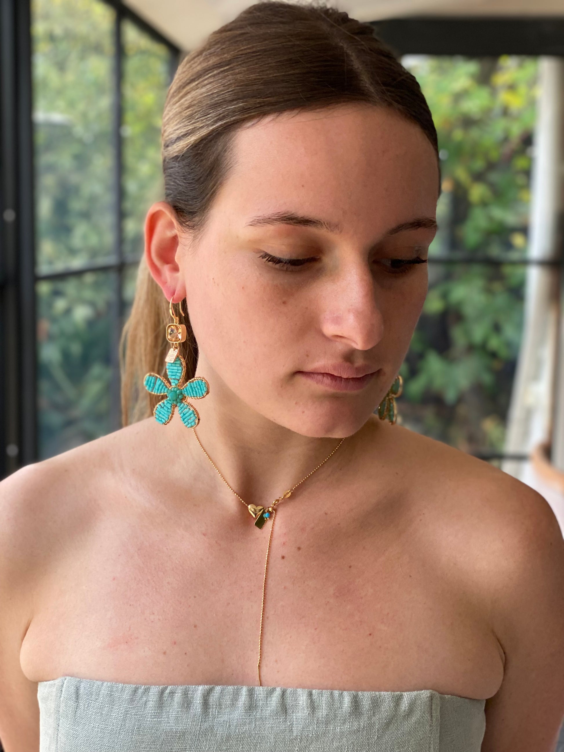 Dusky pink gold plated framed CZ square with a 4.5cm turquoise beaded flower