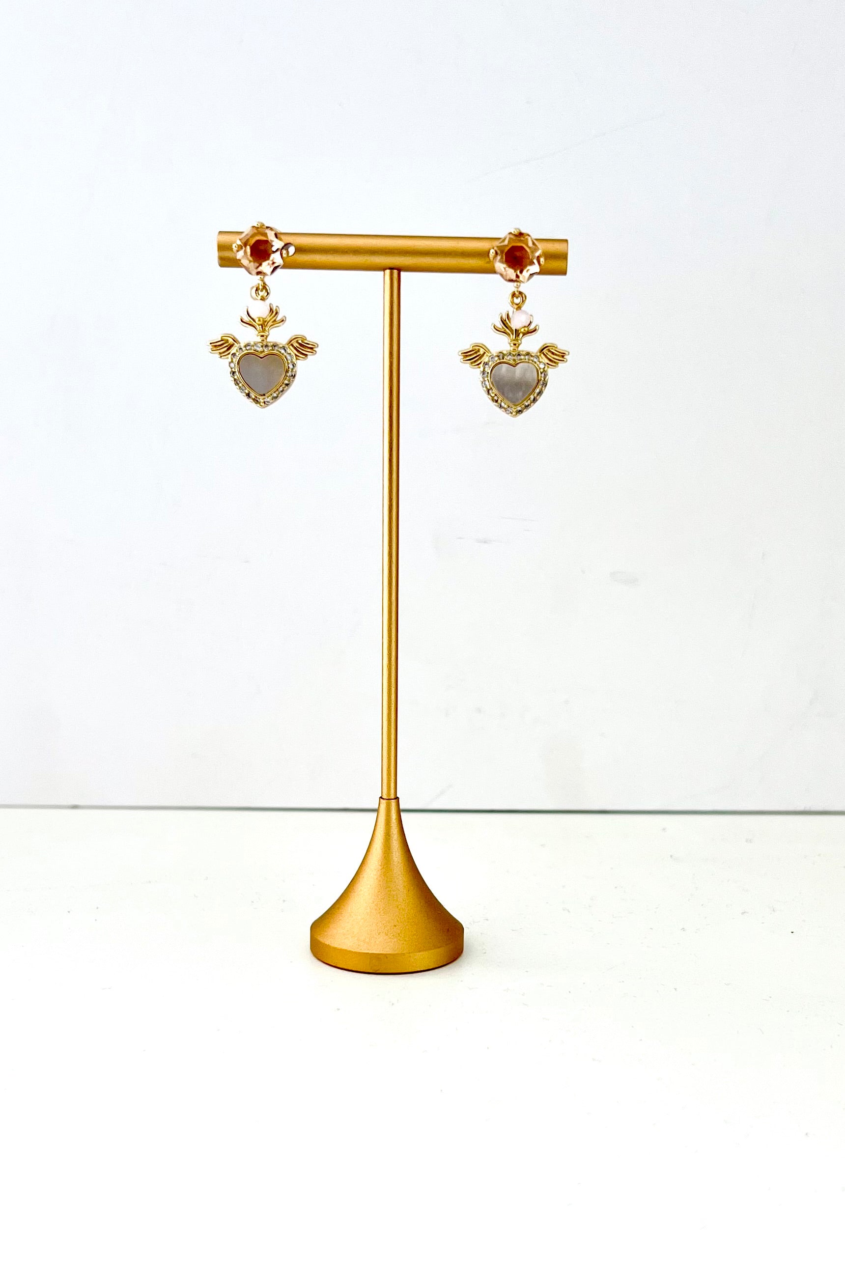 Peach cubic zirconia post with Gold plated pave surrounded Mother of Pearl heart