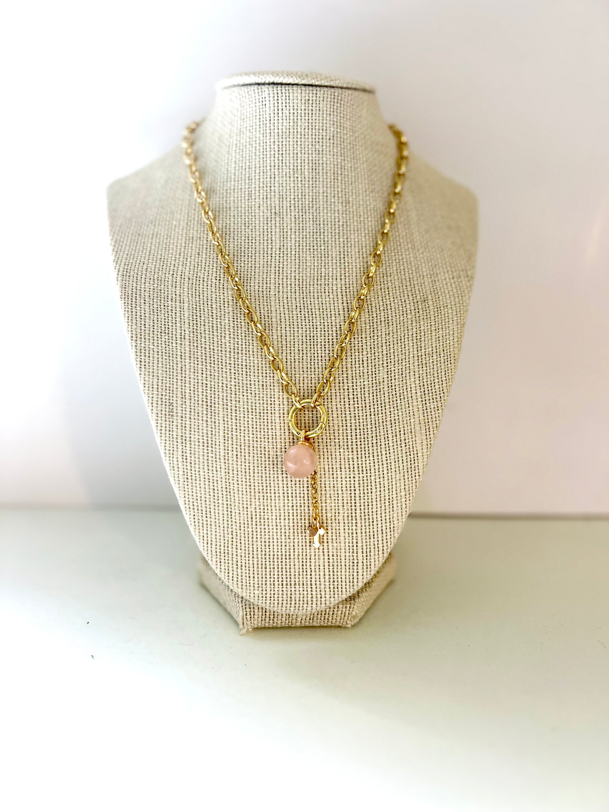 18k gold plated 7.5mm x 8mm rolo chain 60 cm long with a 6cm extension chain. With a 12mm rose quartz ball.
